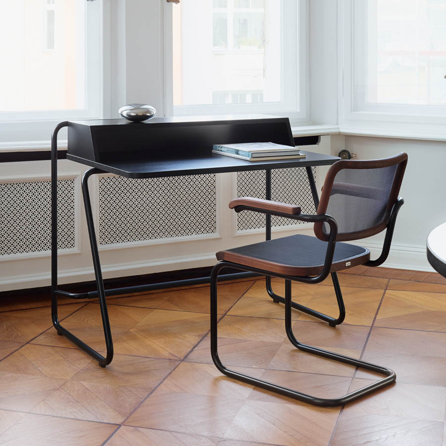 In unterschiedlichen Ausführungen und mit optionalem Zubehör wird der filigrane Sekretär S 1200 zu einem ganz persönlichen Möbel und macht das Arbeiten zu einem Erlebnis. Inspiriert ist der Entwurf des Thonet Design Teams von der hauseigenen Kollektion klassischer Stahlrohrmöbel.