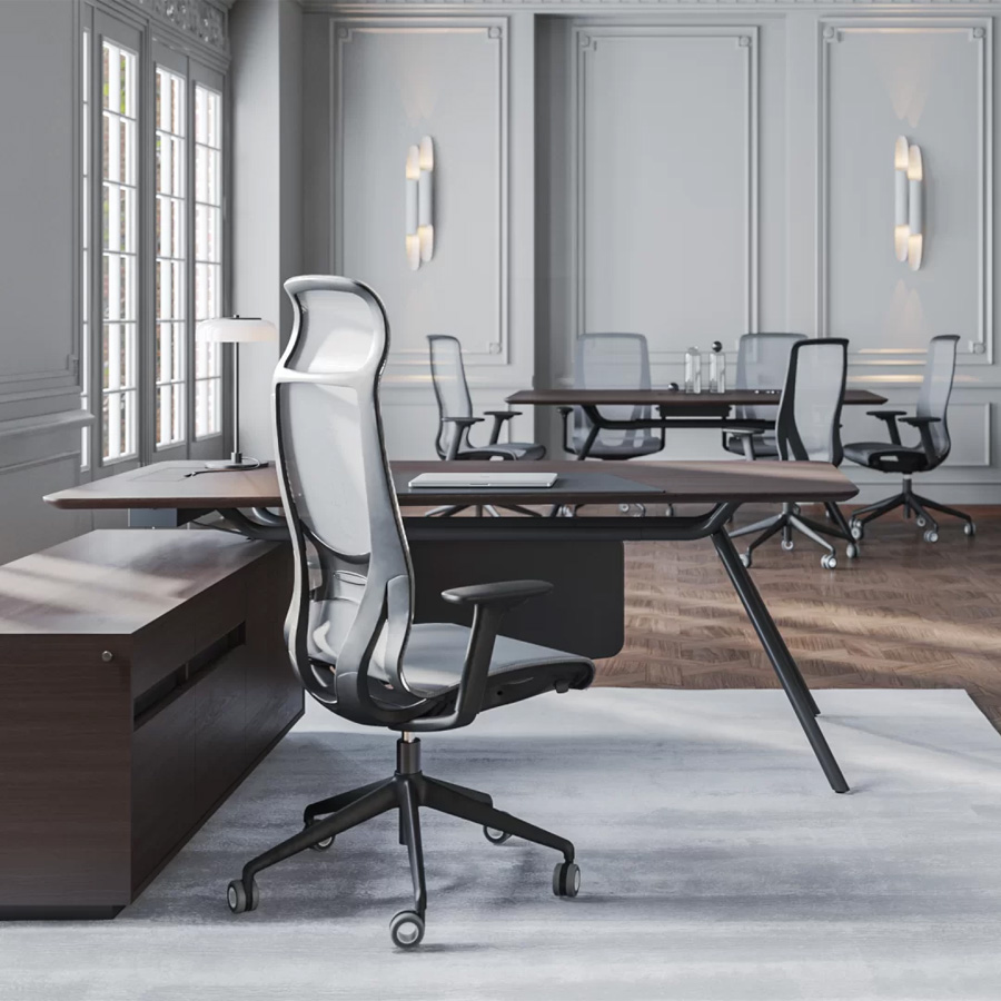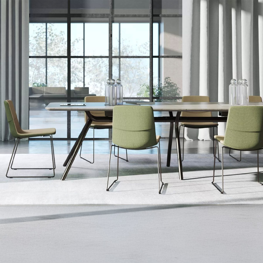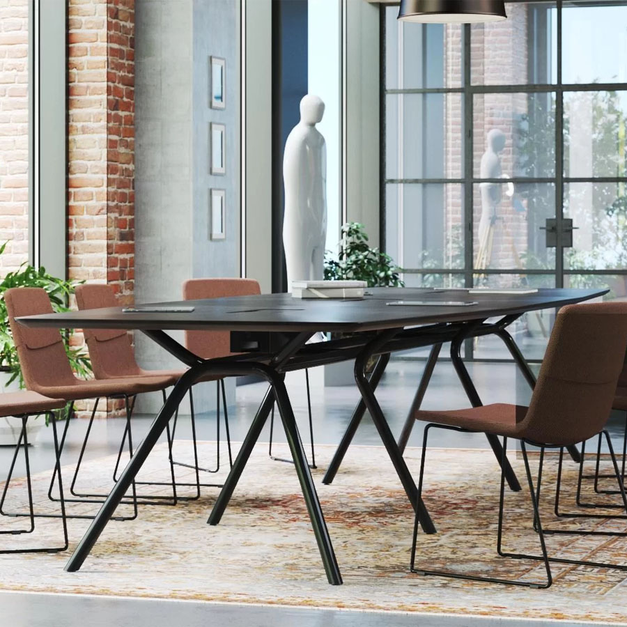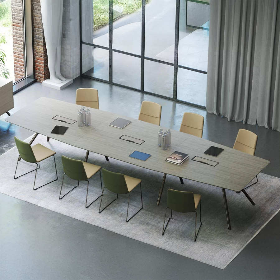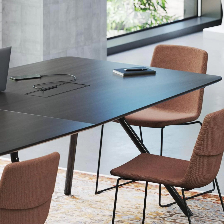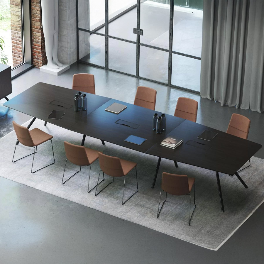 Ob in bootsförmiger oder rechteckiger Ausführung – die weichen Rundungen und großzügigen Tischplatten fördern den Austausch und schaffen eine offene Gesprächsatmosphäre. Die integrierten Stromversorgungslösungen und durchdachten Details sorgen für höchste Funktionalität im Besprechungsalltag. Gleichzeitig unterstreicht die architektonische Formsprache mit markanten Metallfüßen den repräsentativen Charakter dieses Möbelstücks.
