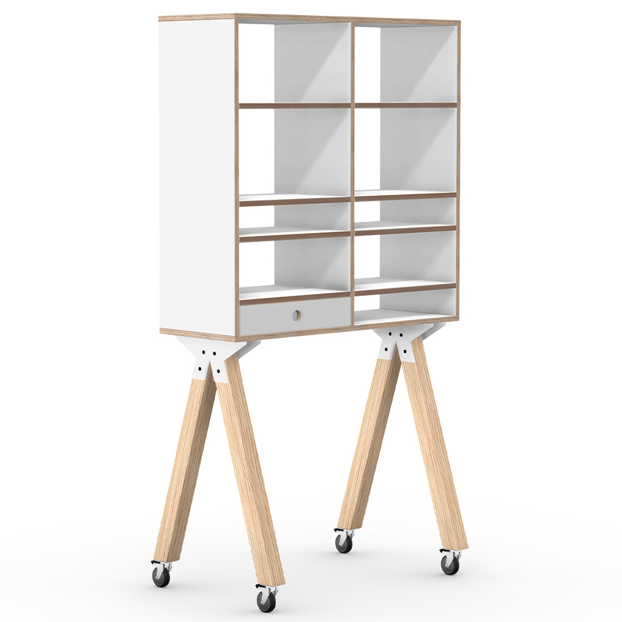 Das mobile, offene Regal ist von beiden Seiten aus zugänglich und hält alle Materialien, die für den kreativen Prozess notwendig sind, griffbereit. Als Raumteiler sorgt es für Ruhe, ohne den Bereich völlig abzuschotten. Das innovative Klettsystem in Kombination mit dem FLYCHART verwandelt das TEAMSHELF in ein mobiles Whiteboard.