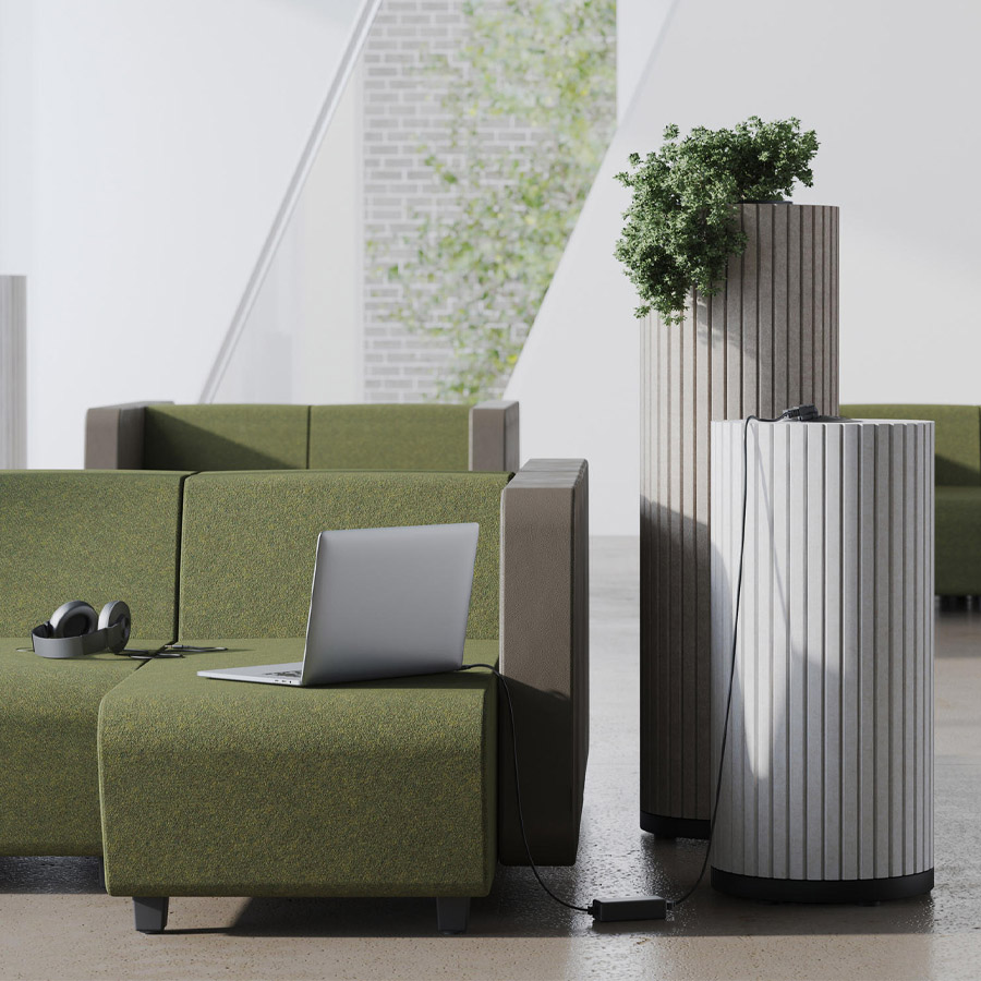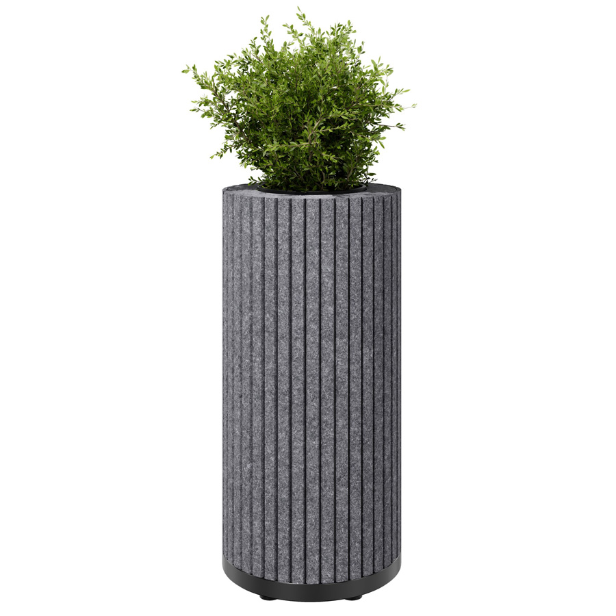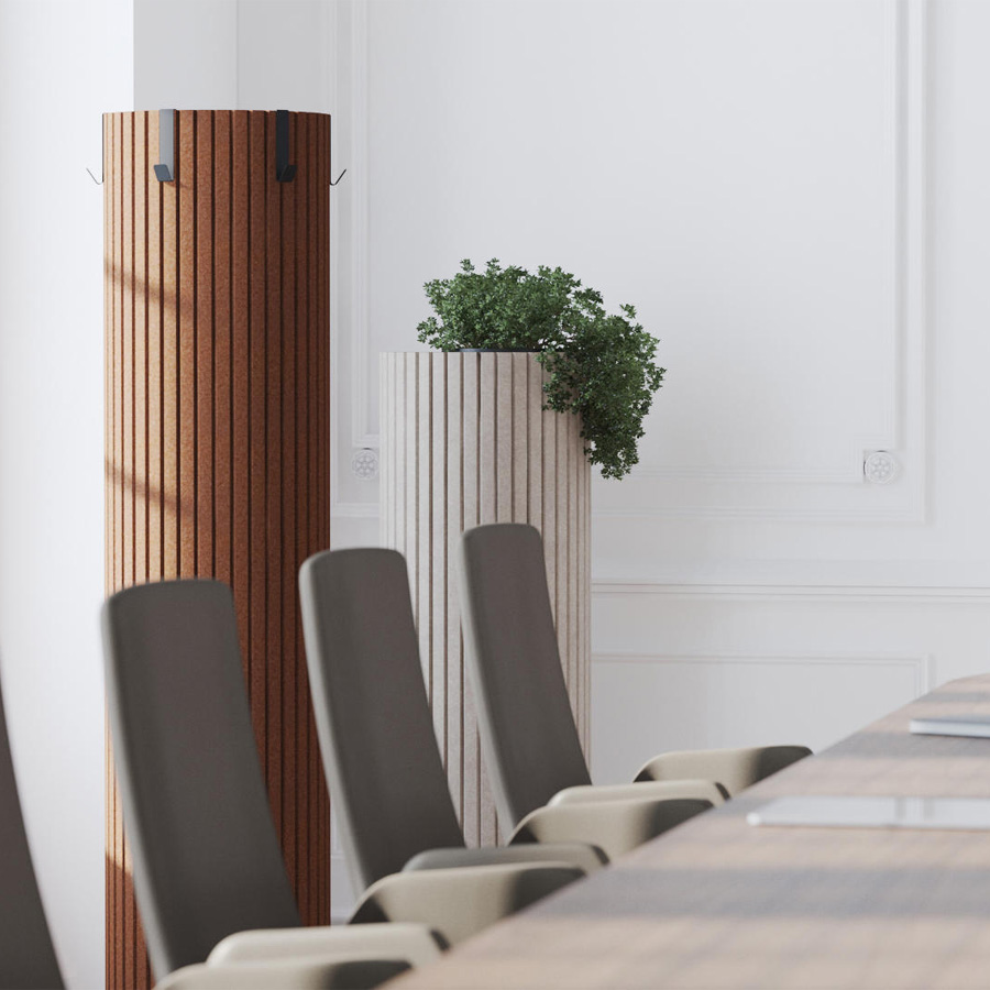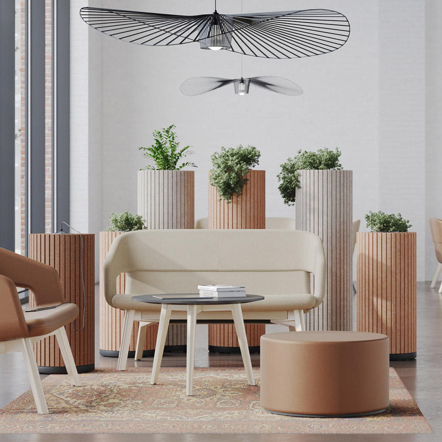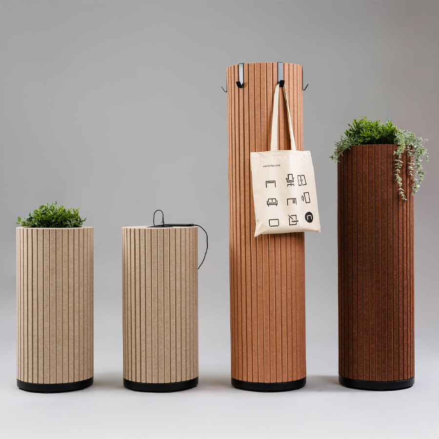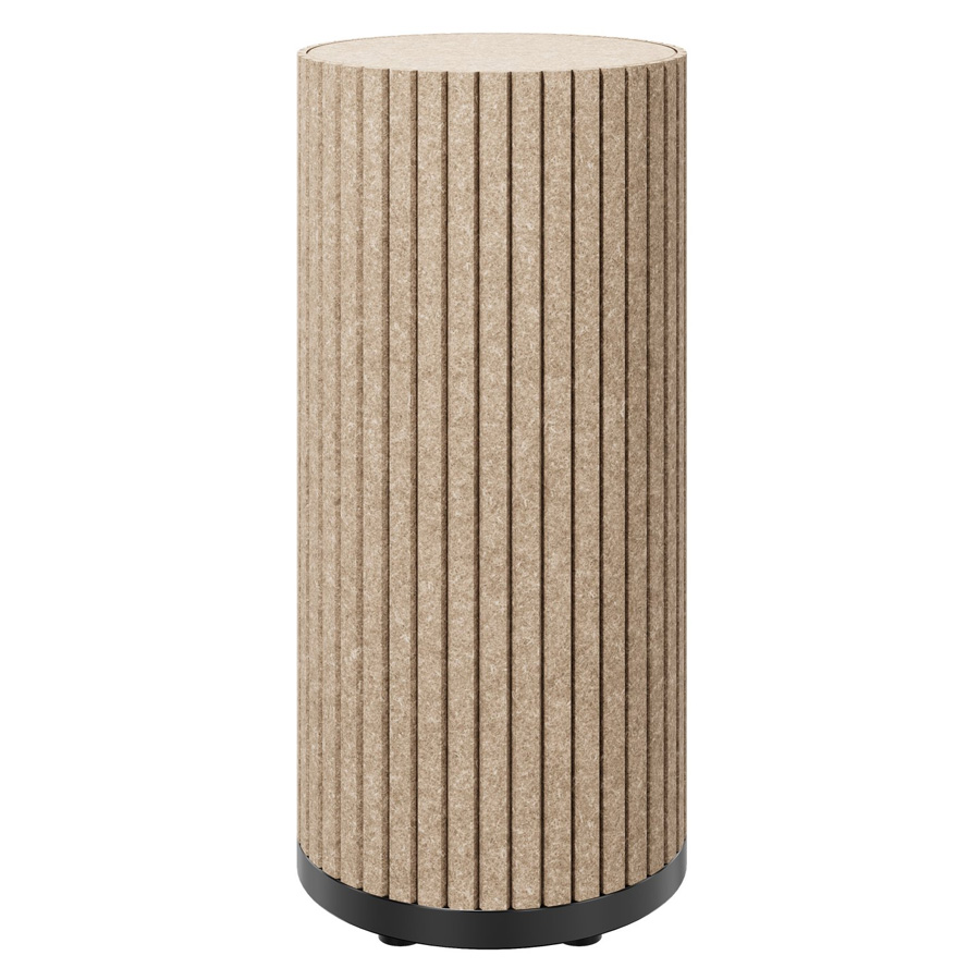 Die zylindrischen Säulen sind mit schallabsorbierendem PET-Filz ummantelt, der Umgebungsgeräusche wirksam reduziert und so für mehr Ruhe in offenen Arbeits- oder Aufenthaltsbereichen sorgt.