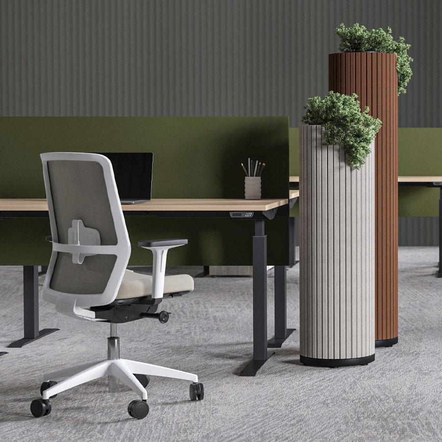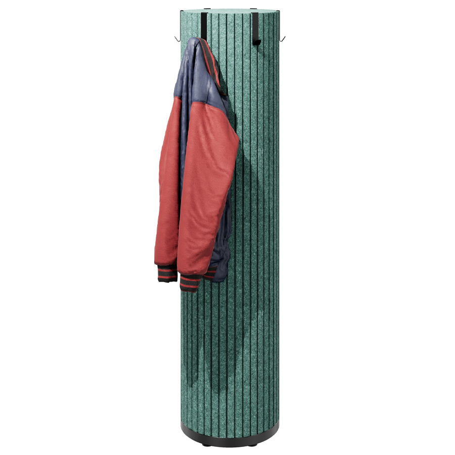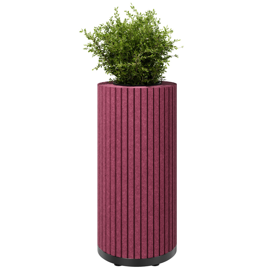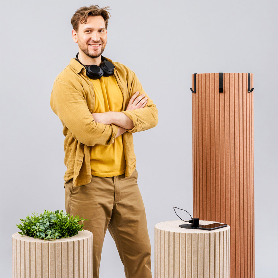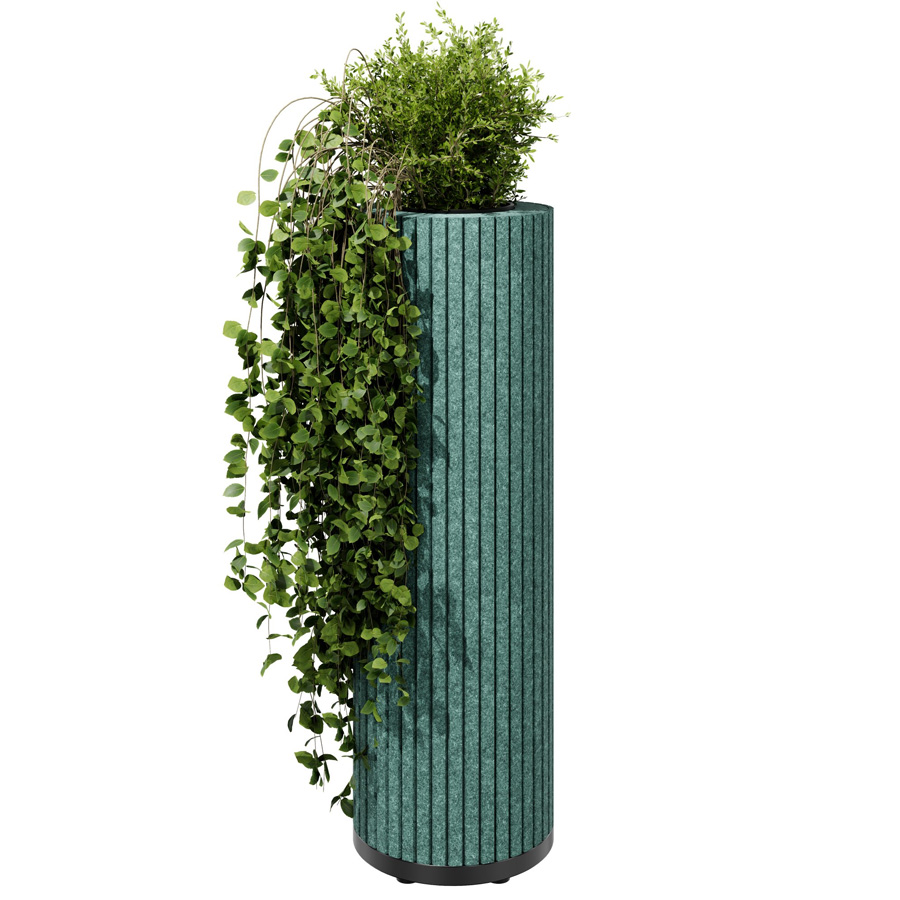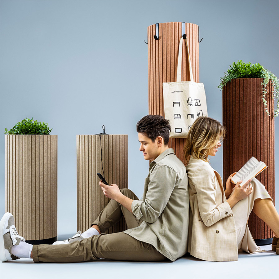 Die zylindrischen Säulen sind mit schallabsorbierendem PET-Filz ummantelt, der Umgebungsgeräusche wirksam reduziert und so für mehr Ruhe in offenen Arbeits- oder Aufenthaltsbereichen sorgt.