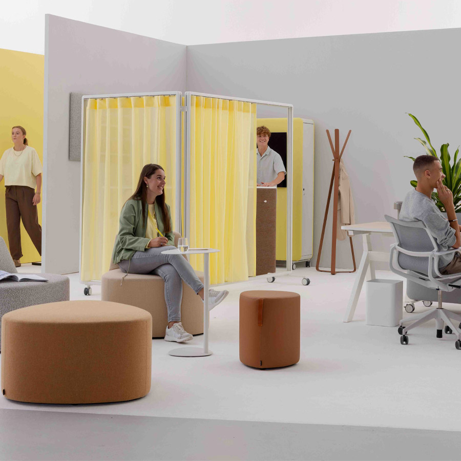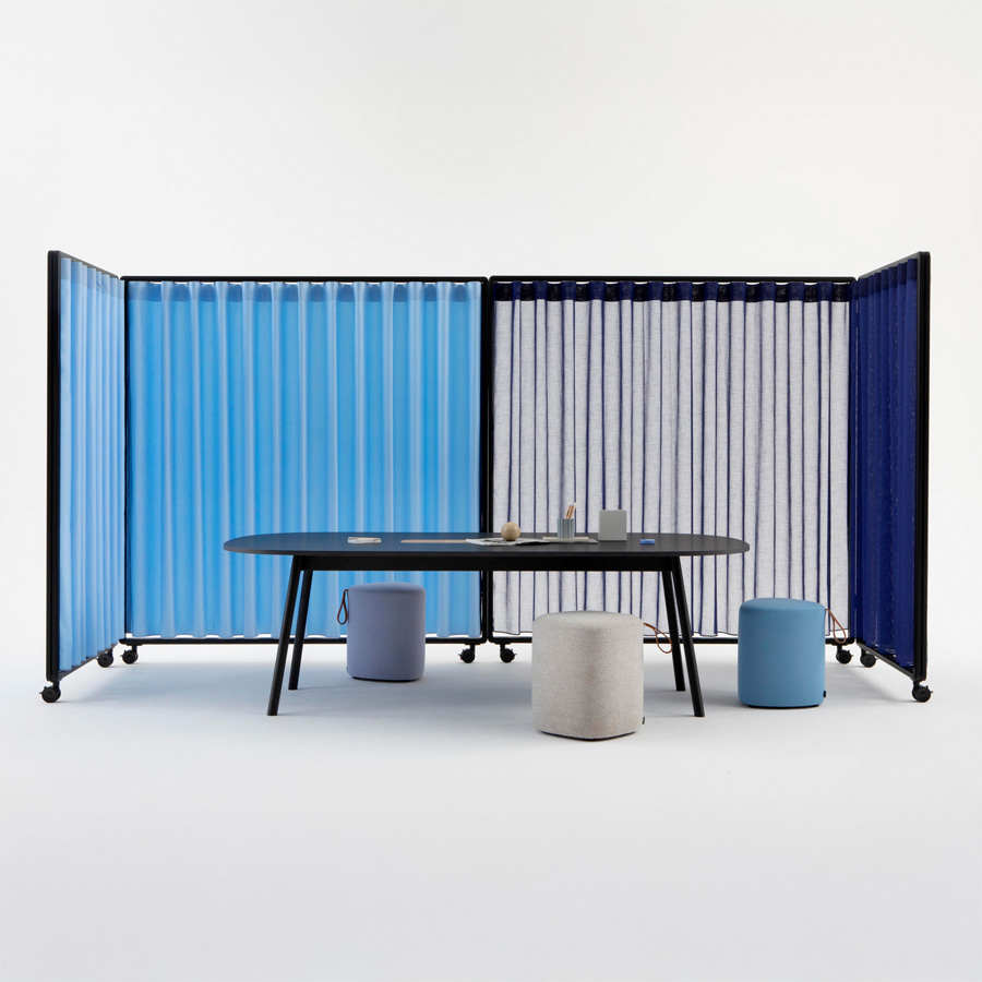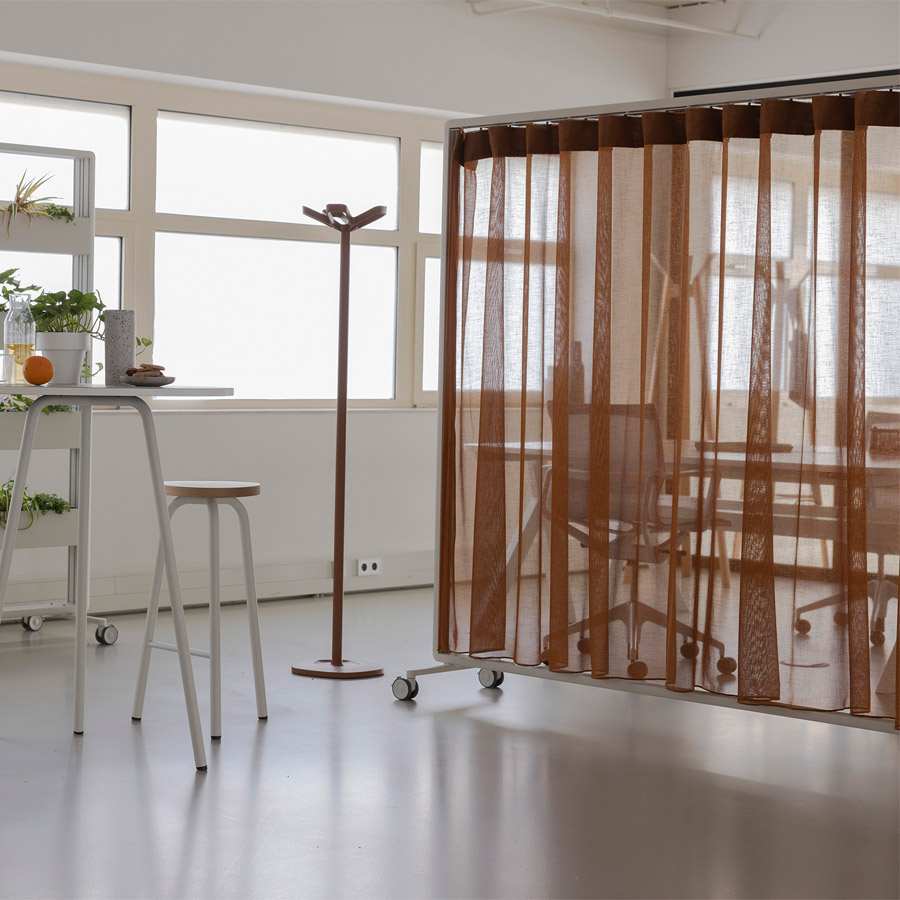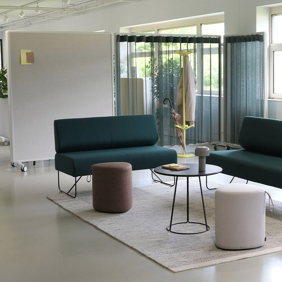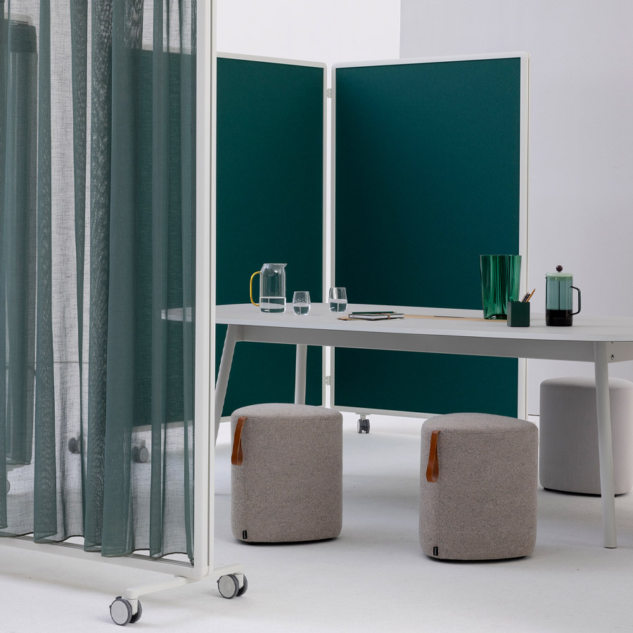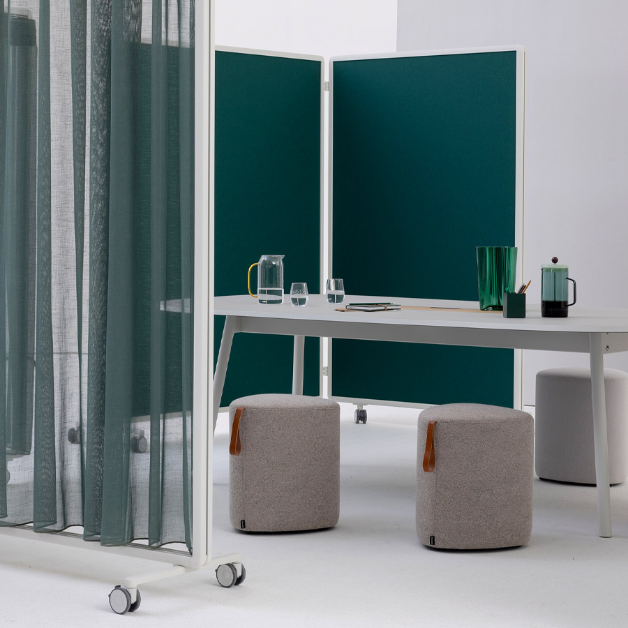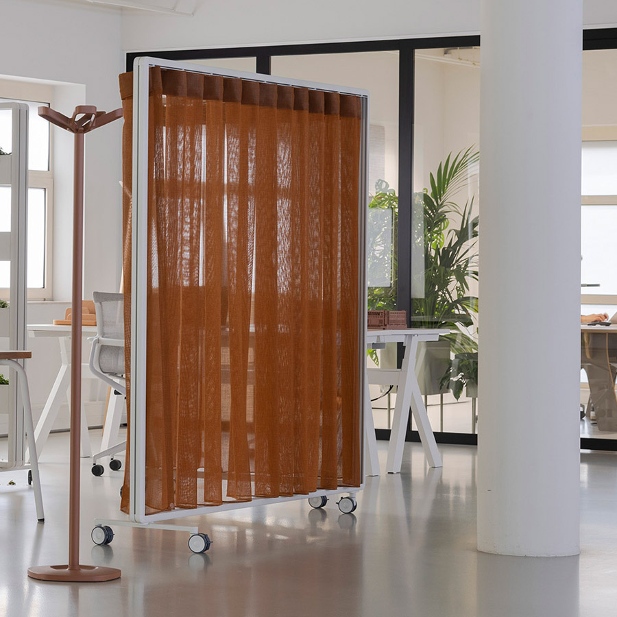 Ob mit Vorhang, Paneelen oder offen – Patio ermöglicht die einfache Gliederung von Arbeits- und Aufenthaltsbereichen, ohne bauliche Veränderungen vorzunehmen.