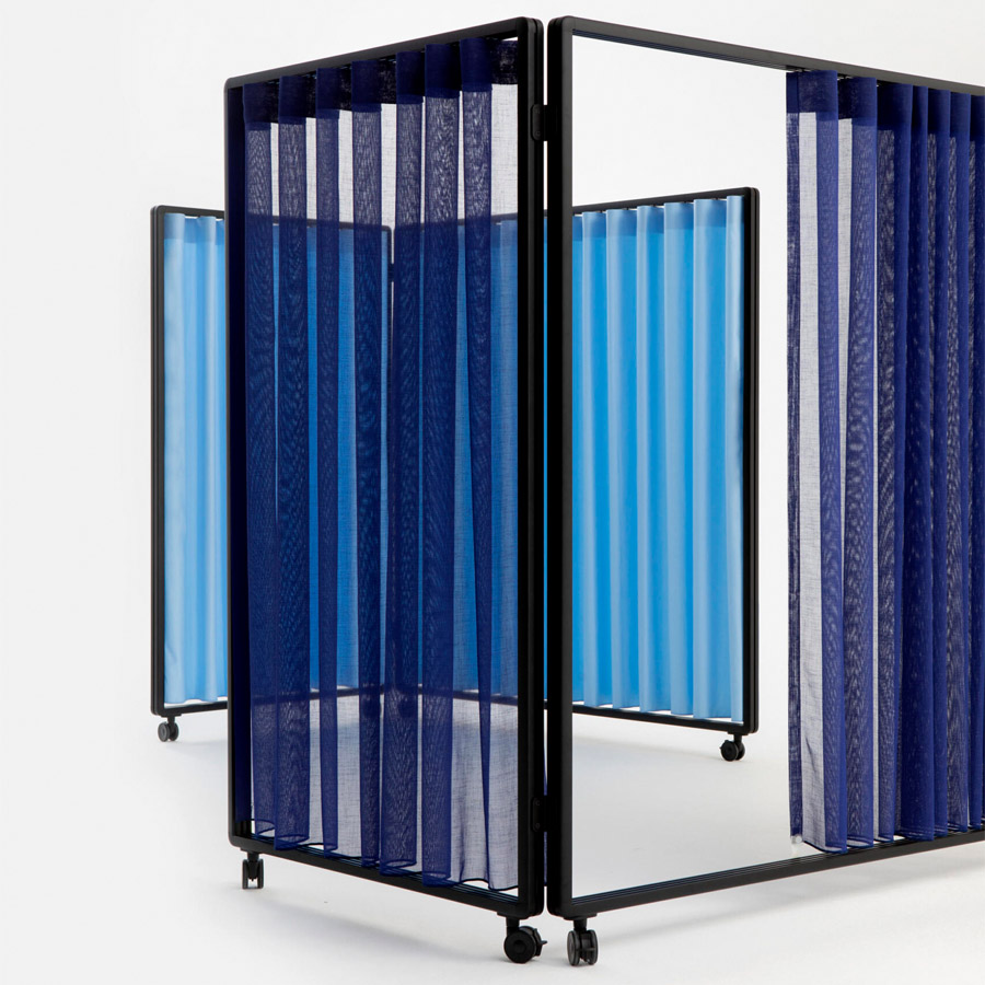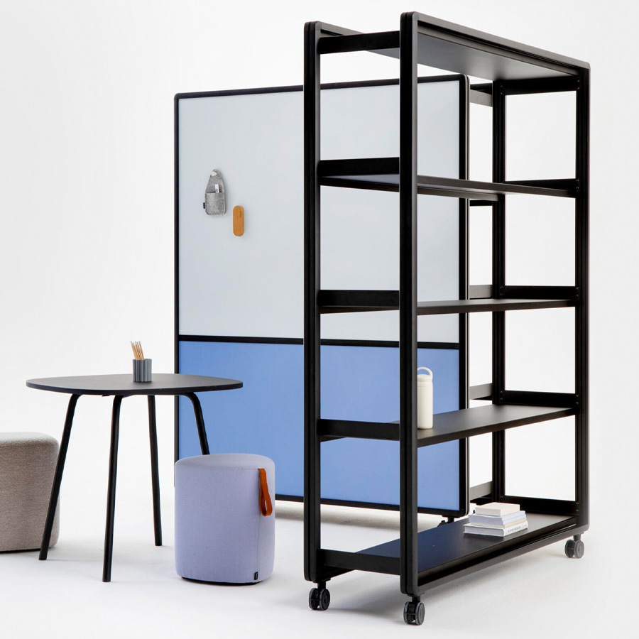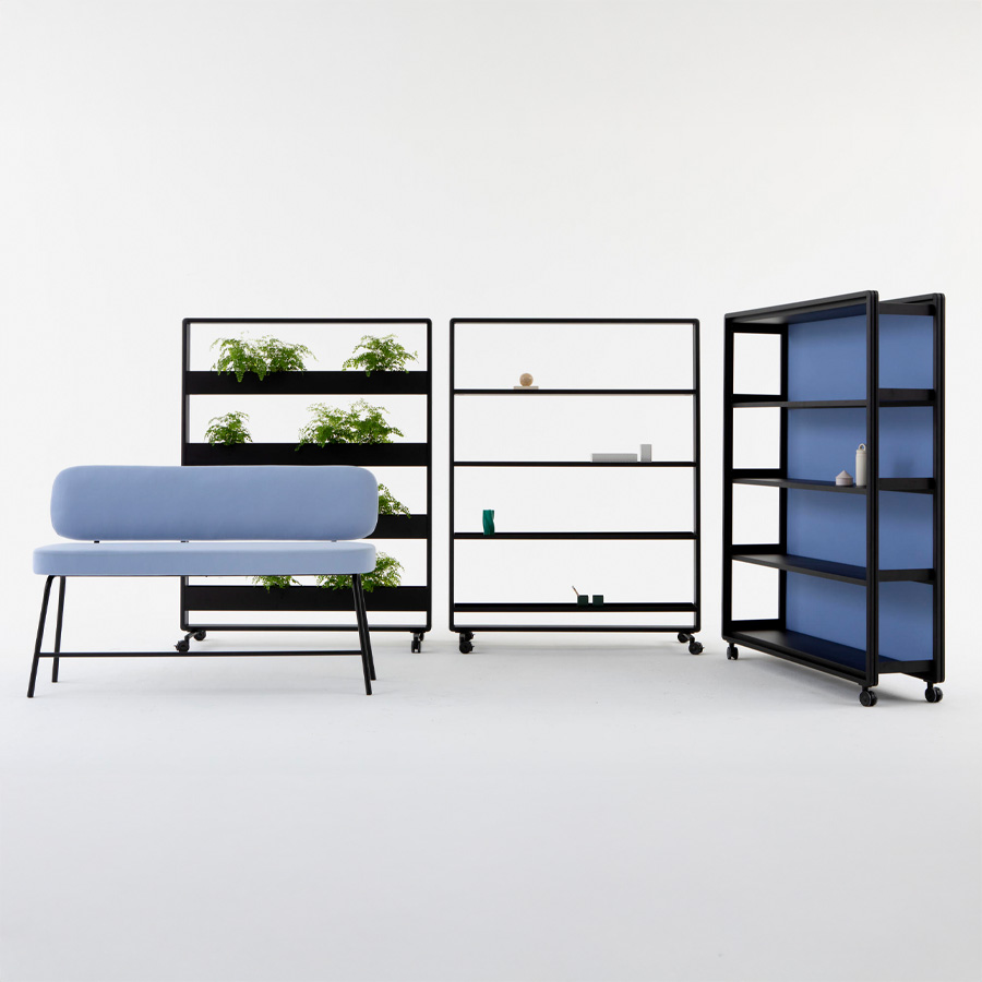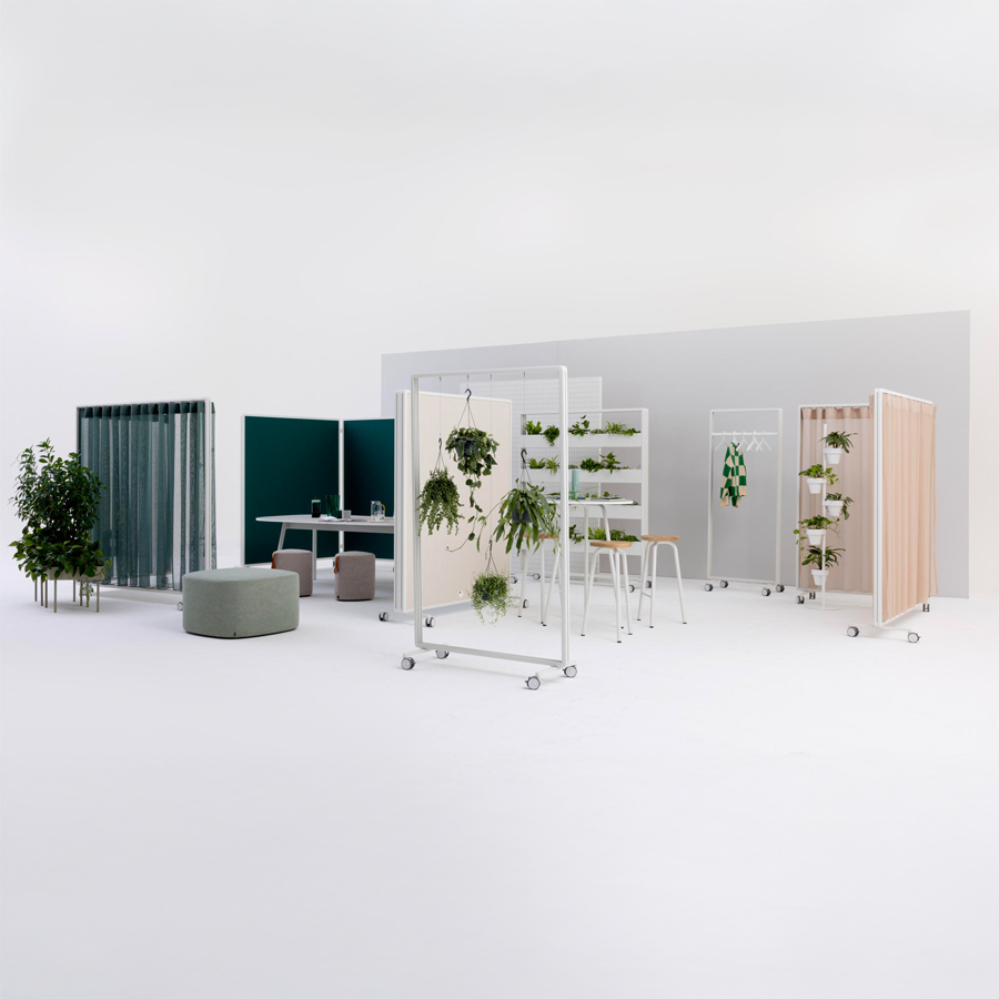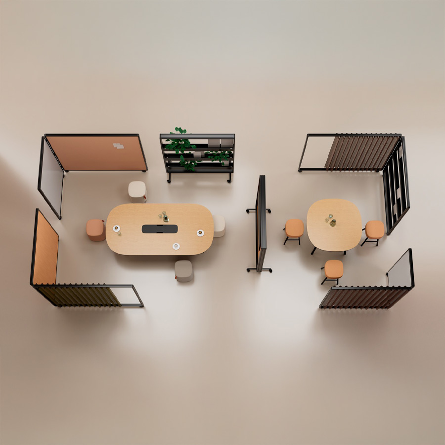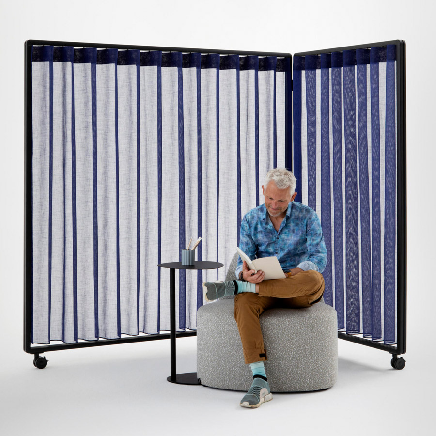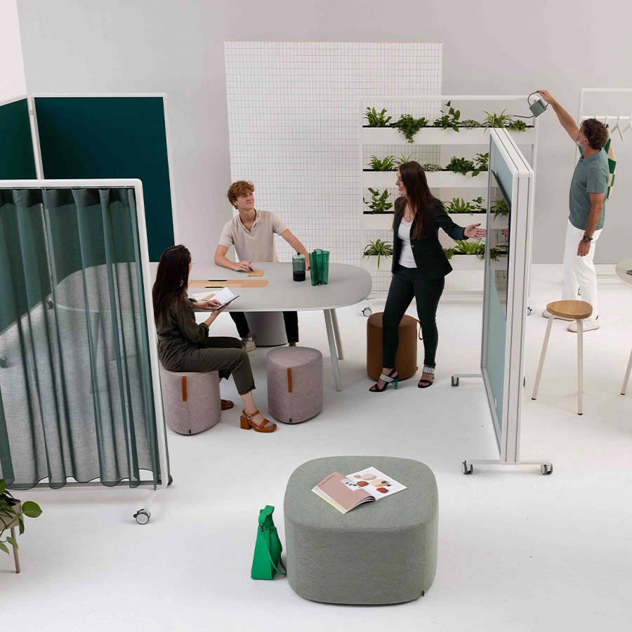 Ob mit Vorhang, Paneelen oder offen – Patio ermöglicht die einfache Gliederung von Arbeits- und Aufenthaltsbereichen, ohne bauliche Veränderungen vorzunehmen.