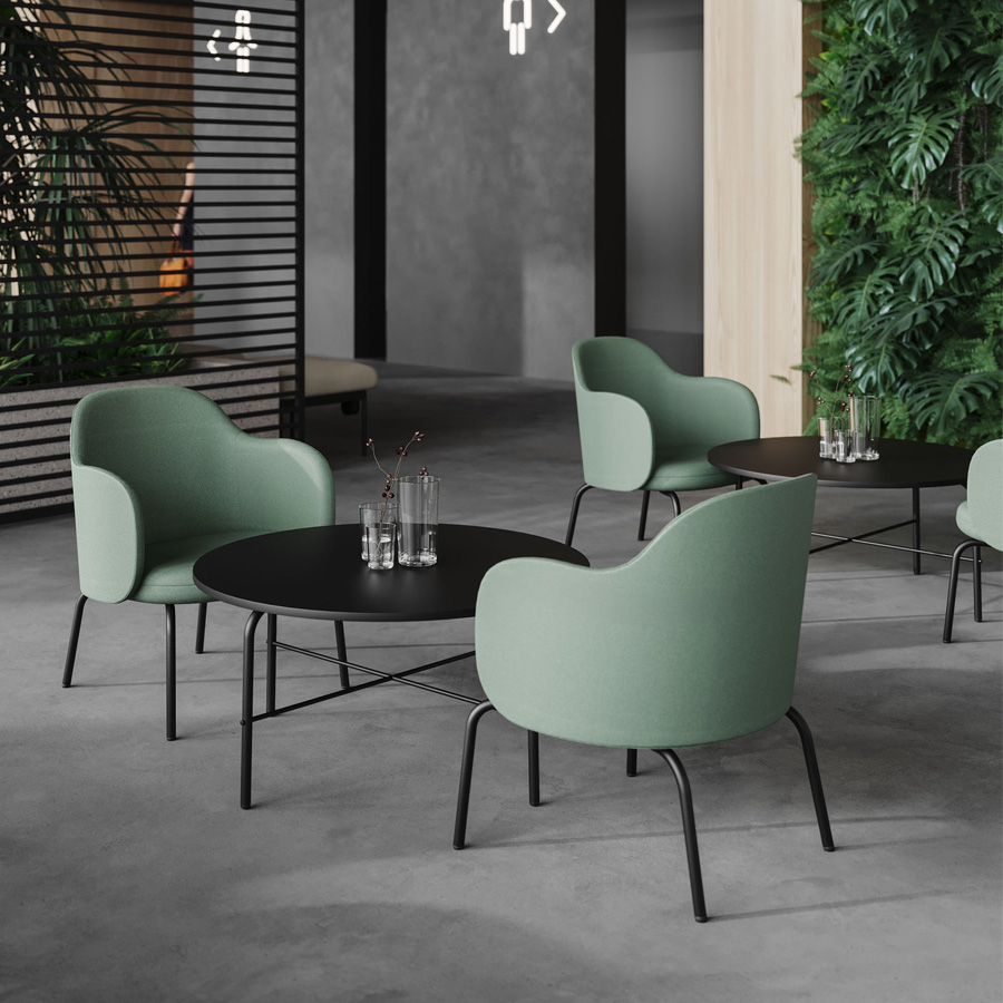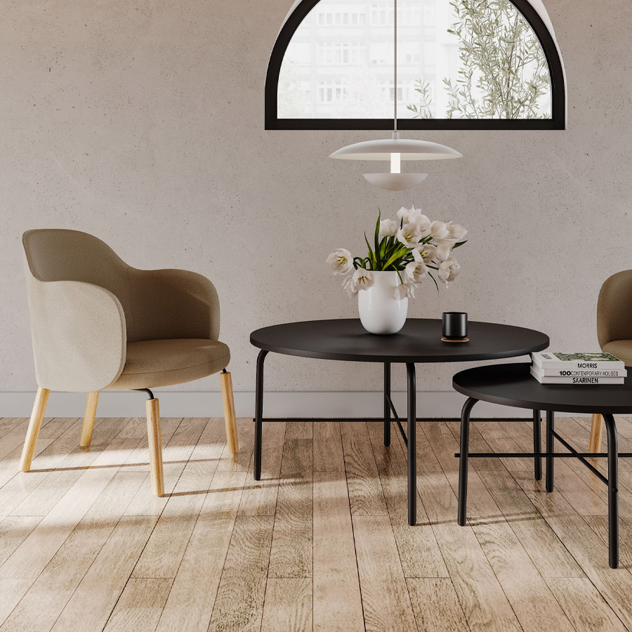 Die beiden Tischgrößen lassen sich elegant überlappen und schaffen elegante Set-Lösungen für Lounge- und Wartezonen. Ideal, um Designharmonie mit variabler Funktion zu verbinden