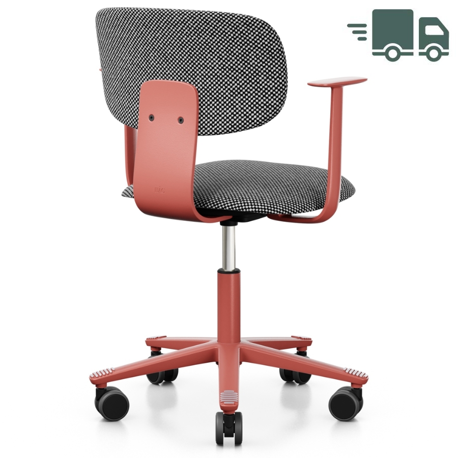Hier angeboten wird der HAG Tion 2160 mit fixen Armlehnen in Blush Rose (Rückenlehnenbügel, Alu-Armlehnen, Gasfederabdeckung sowie Alu-Fußkreuz). Die Sitz- und Rückenschale ist gepolstert, bezogen mit dem Stoff Sisu SIS165 black/white. Verbaut ist die 150 mm Standard-Gasfeder mit einer Sitzhöhenverstellung zwischen 408 - 542 mm.
