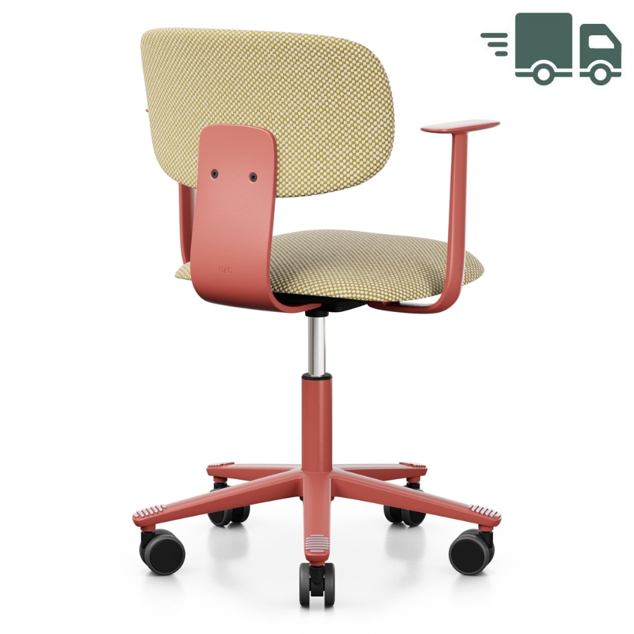 Hier angeboten wird der HAG Tion 2160 mit fixen Armlehnen in Blush Rose (Rückenlehnenbügel, Alu-Armlehnen, Gasfederabdeckung sowie Alu-Fußkreuz). Die Sitz- und Rückenschale ist gepolstert, bezogen mit dem Stoff Sisu SIS405 yellow/white. Verbaut ist die 150 mm Standard-Gasfeder mit einer Sitzhöhenverstellung zwischen 408 - 542 mm.
