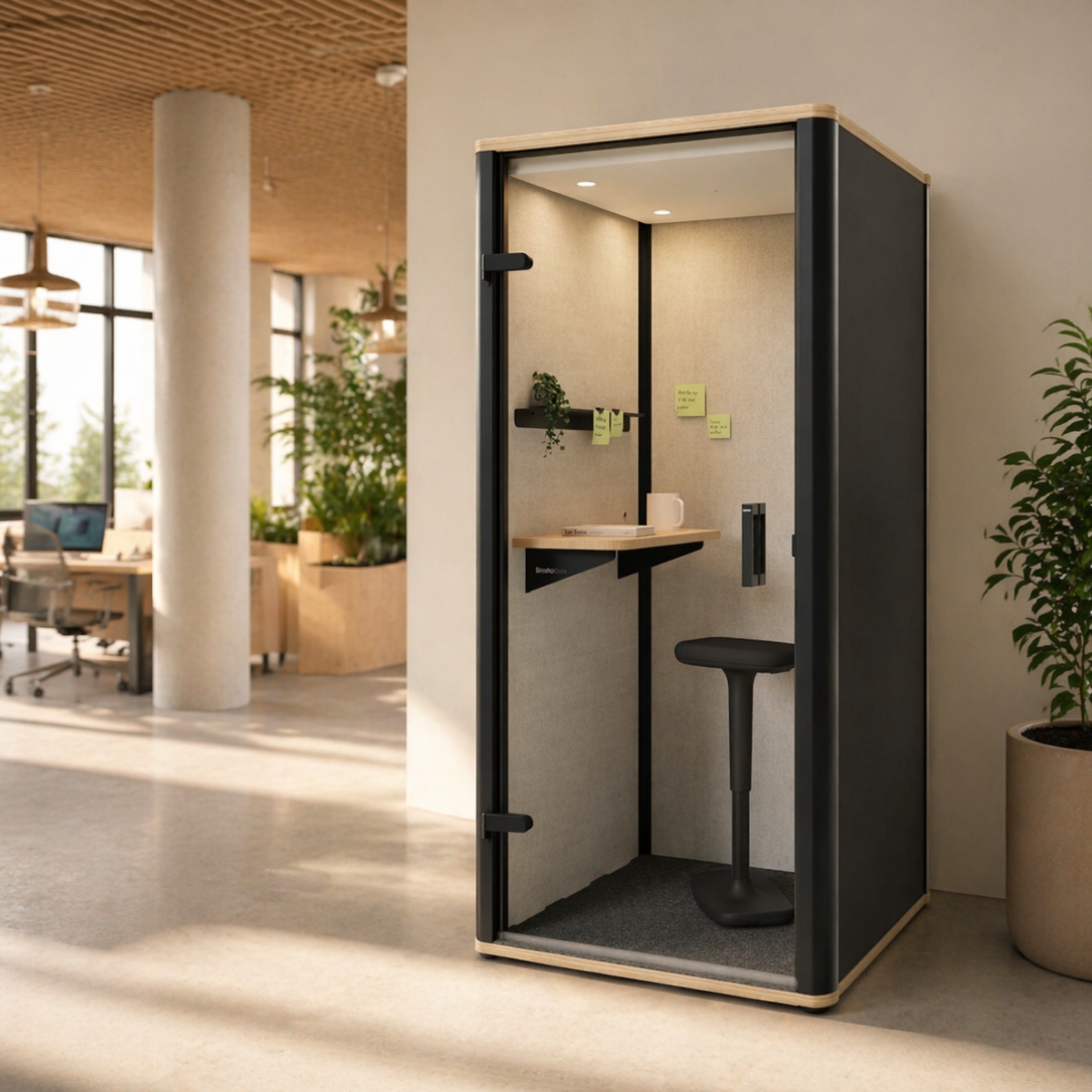 Durchdacht, platzsparend und für ungestörtes Arbeiten gemacht: Der bosselino uno garantiert bequemes Arbeiten. Das Ablageboard bietet Platz für Laptop und Notizbuch und die Wandhalterung ermöglicht Videocalls auf Augenhöhe. Akustikpaneele aus 100 % recyceltem PET sorgen dafür, dass Umgebungsgeräusche draußen und vertrauliche Gespräche in der Box bleiben. Die blendfreie Beleuchtung und zwei geräuschlose Ventilatoren schaffen eine optimale Arbeitsatmosphäre.