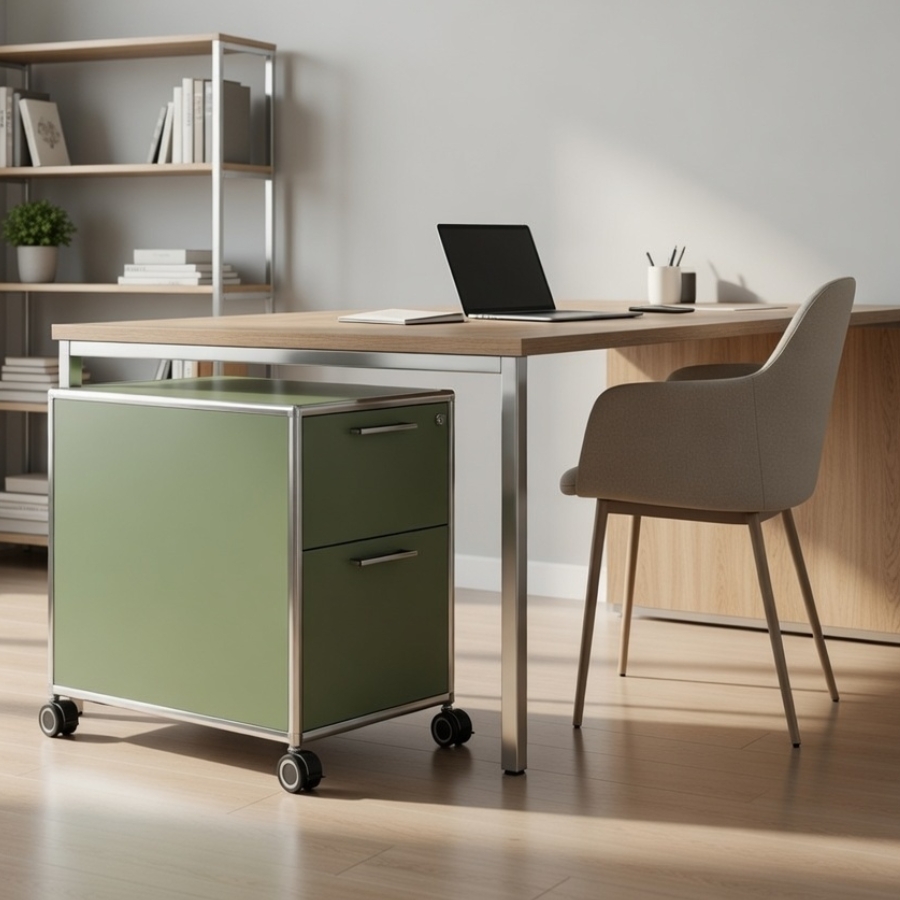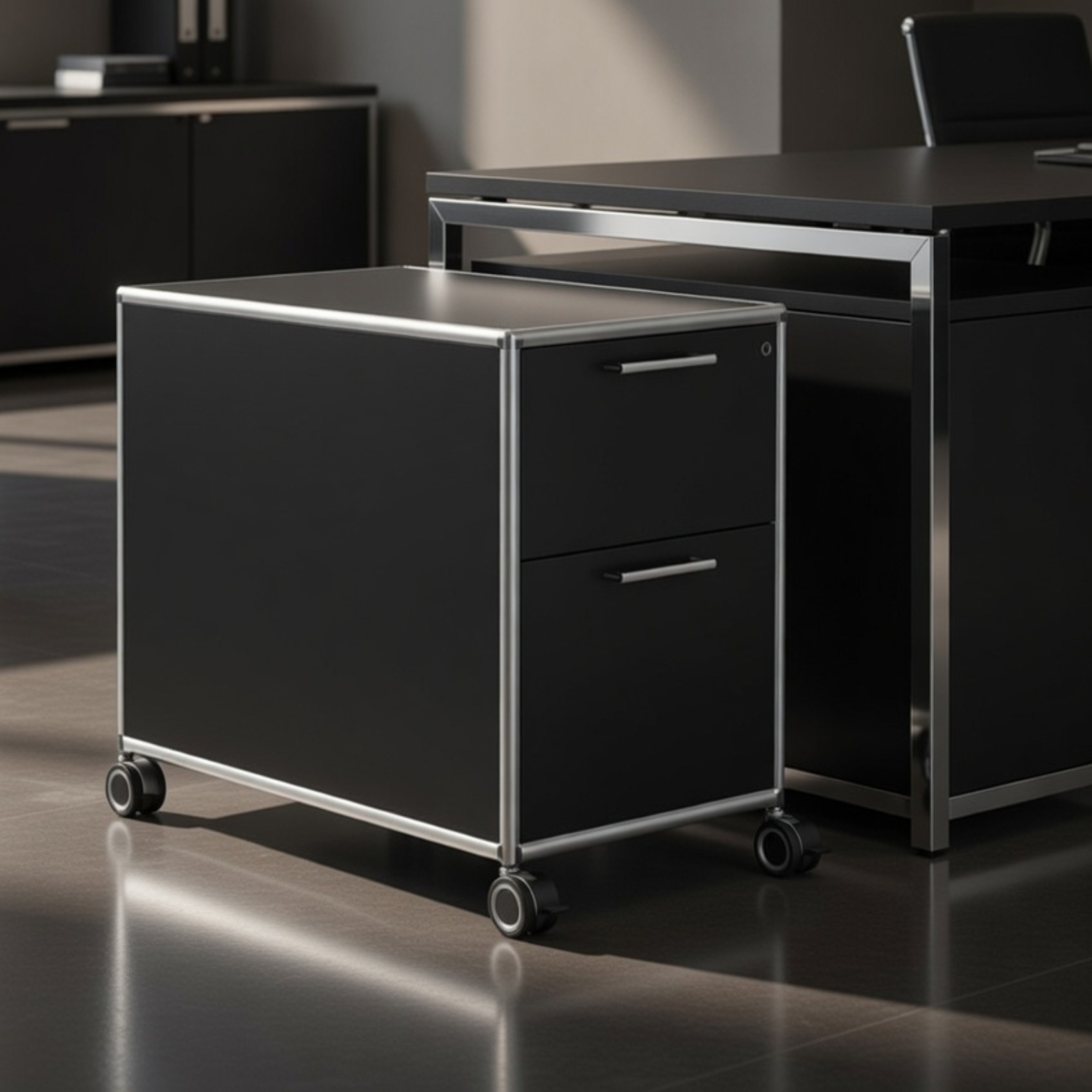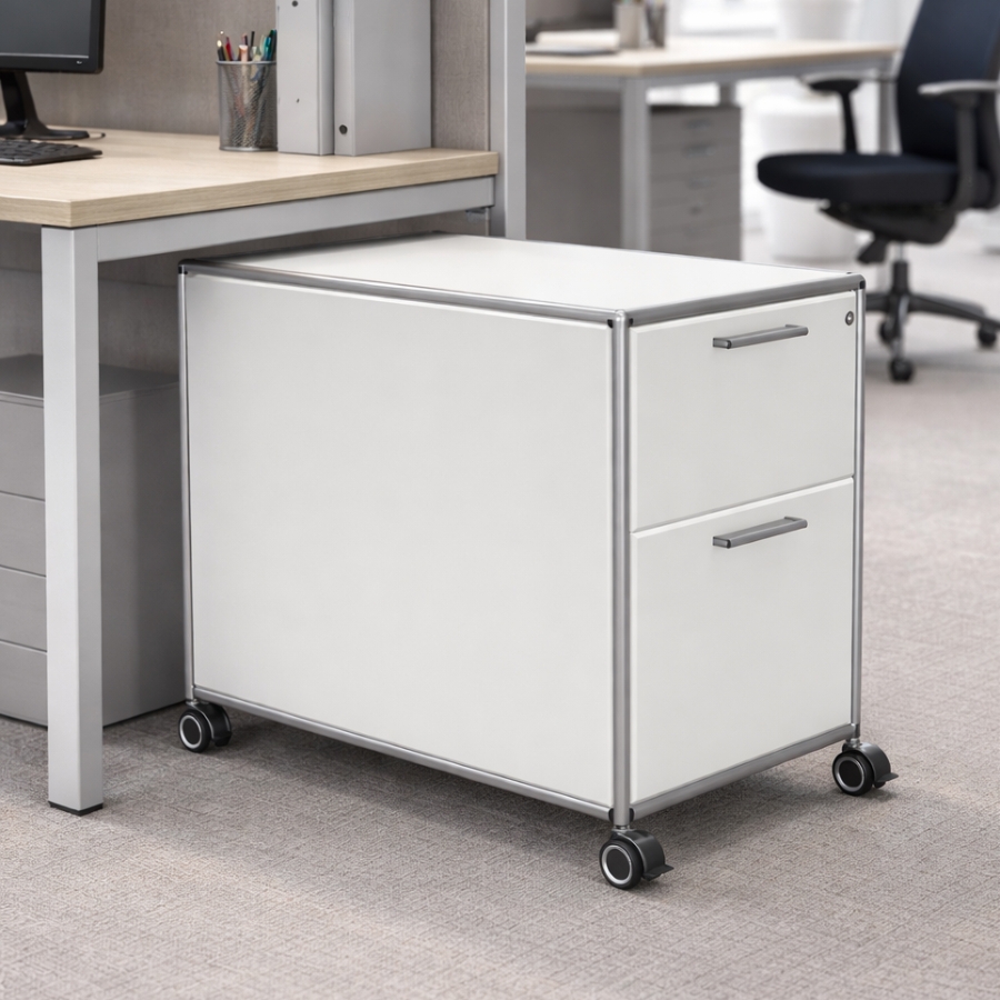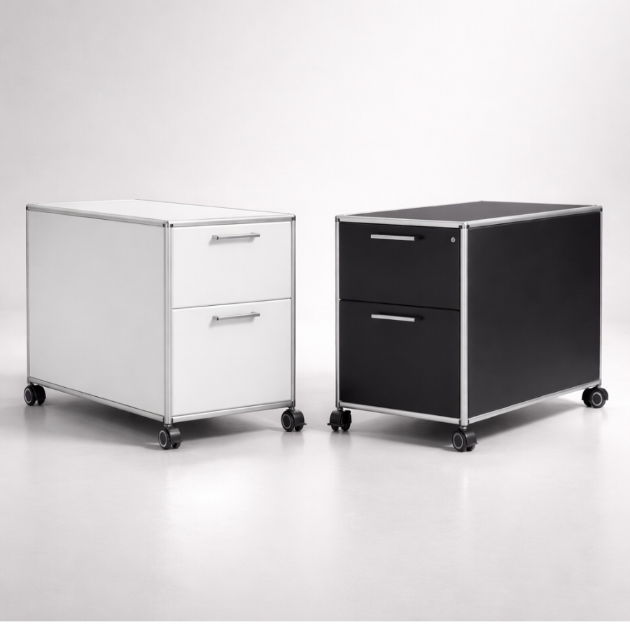 Um die Stabilität des Rollcontainers zu gewährleisten, besteht der Rahmen aus geschlossenen Systemknoten und verchromten Stahlrohren, die bündig mit den Oberflächen abschließen. Die Schubladen selbst lassen sich auch Kugelrollen-Teleskopschienen ausziehen. Dadurch sind sie besonders langlebig, weil sie sich kaum abnutzen. Die Metallgriffe jeder einzelnen Schublade bestehen ebenfalls aus Chrom.
