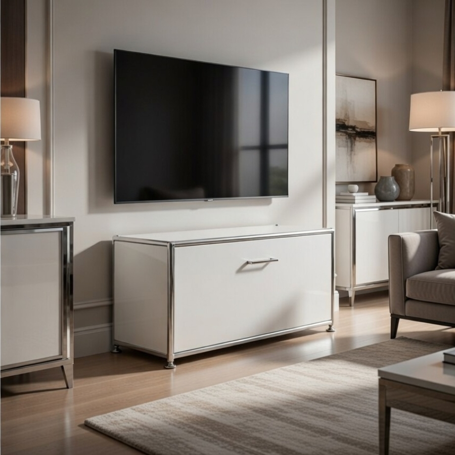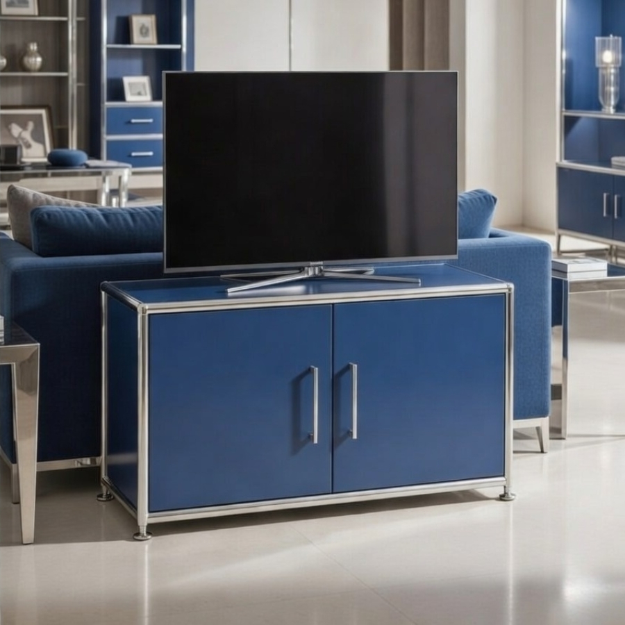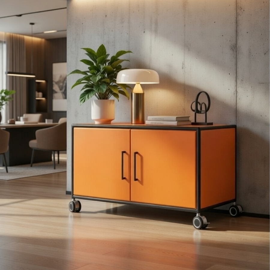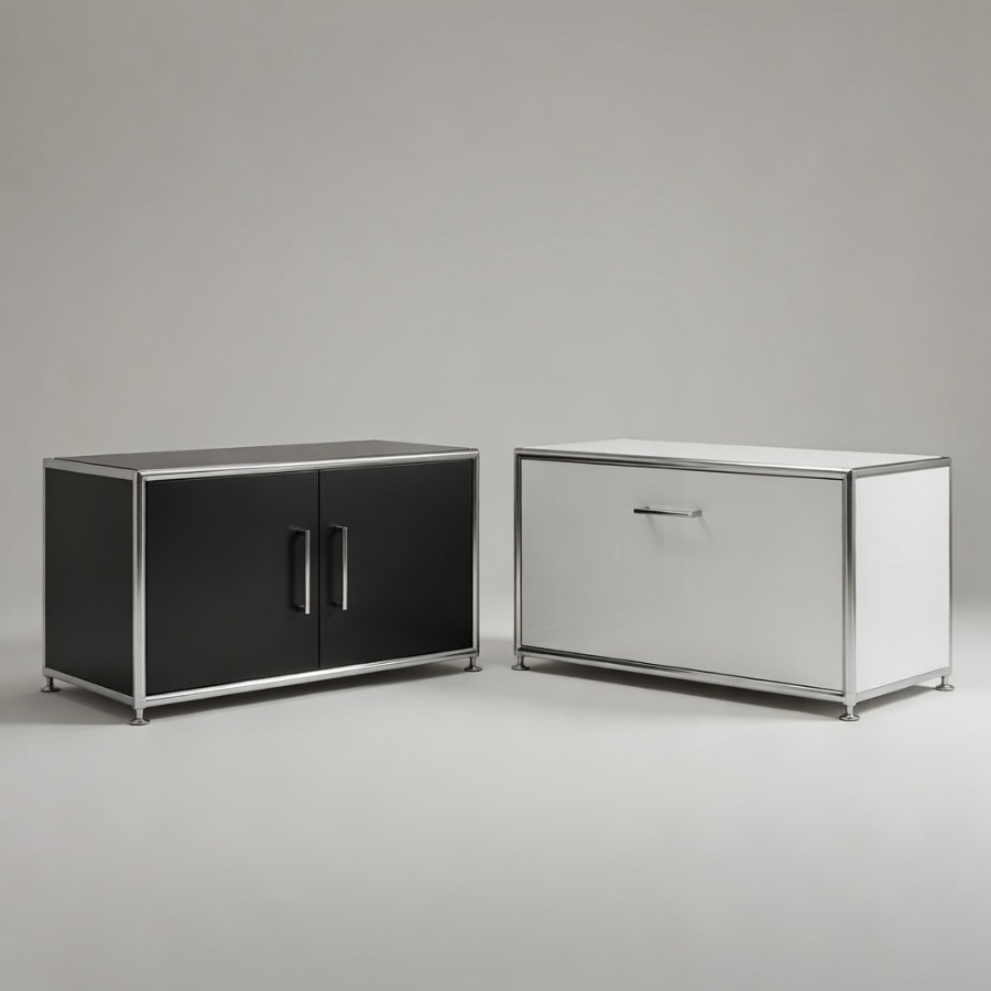 Um diese Stabilität und Flexibilität zu gewährleisten, besteht der Rahmen aus geschlossenen Systemknoten und verchromten Stahlrohren. Die Kombination aus melaminbeschichteten Trägermaterial und Metall ermöglicht ein nahezu lautloses Schließen von Türen und Klappen und ebenso einen schnellen Zugriff auf ihre Unterlagen und Ordner. Gegen Aufpreis ist es auch möglich, das Schrankmodul mit einem Schloss zu versehen.
