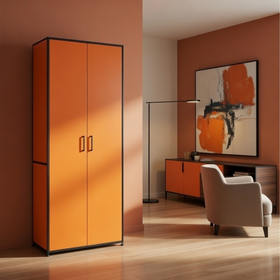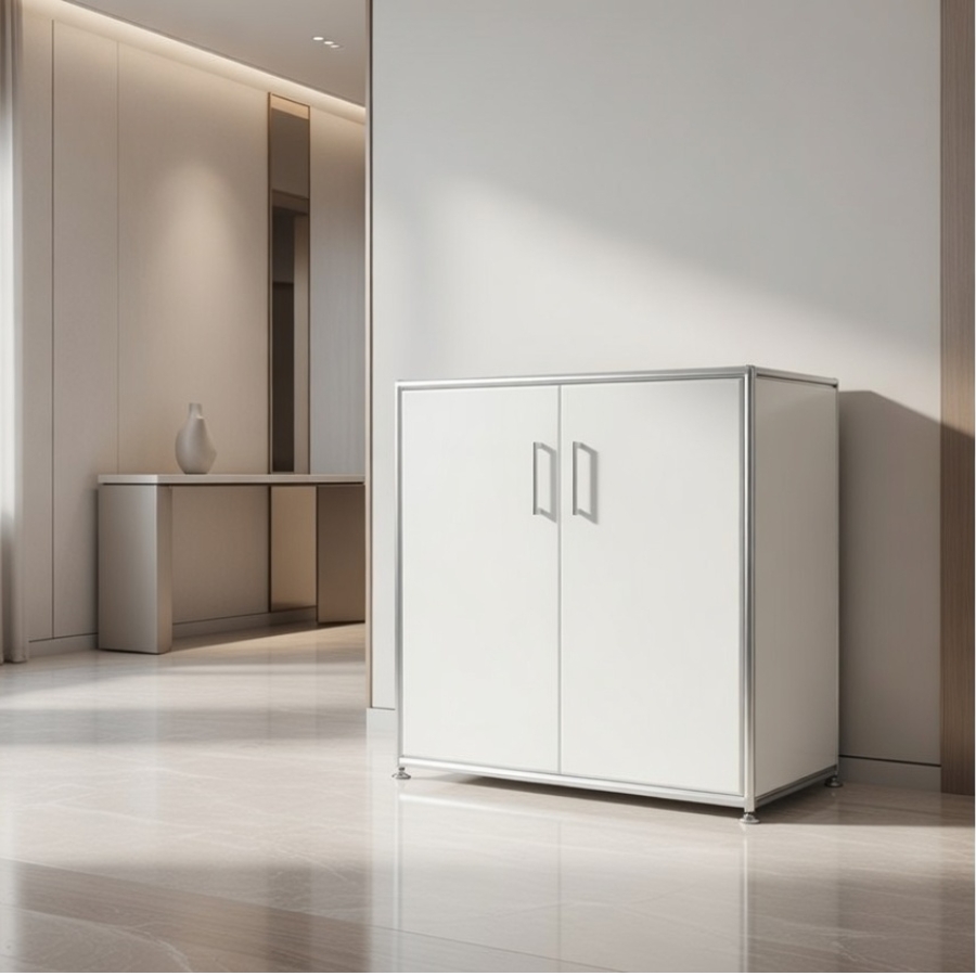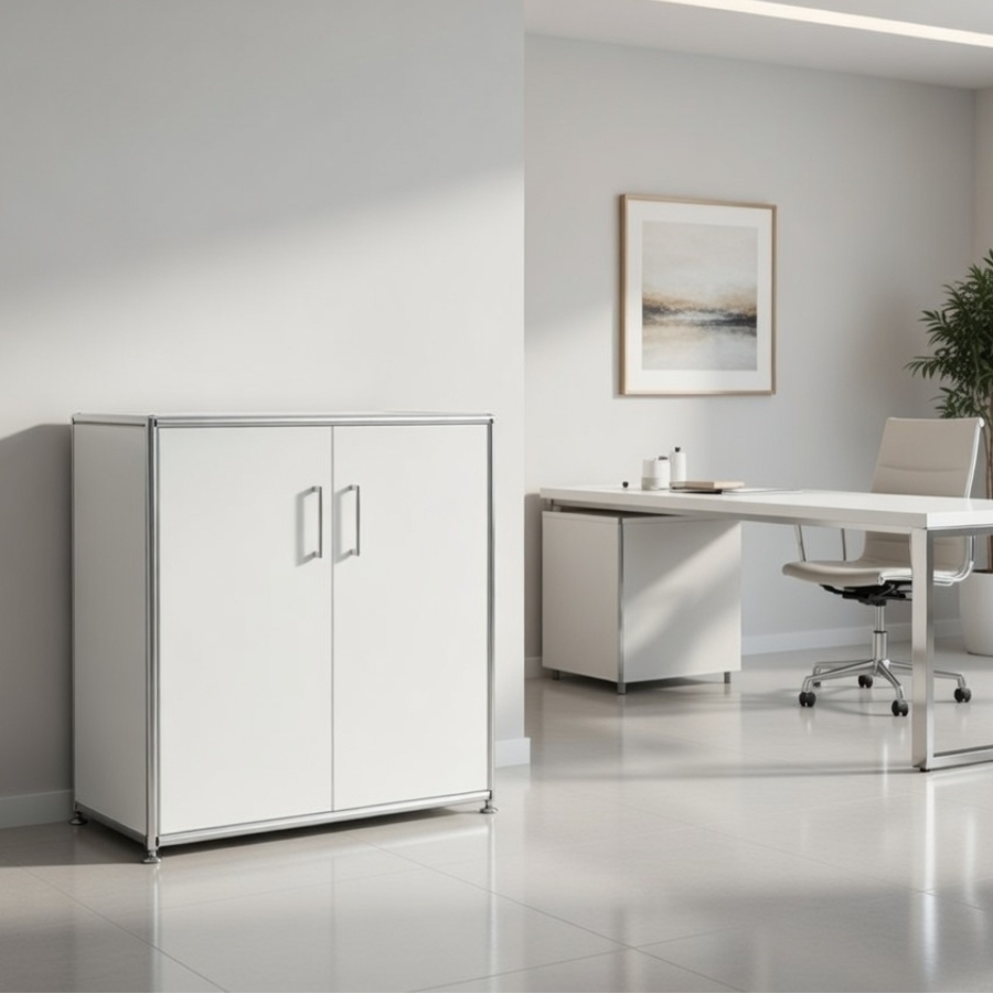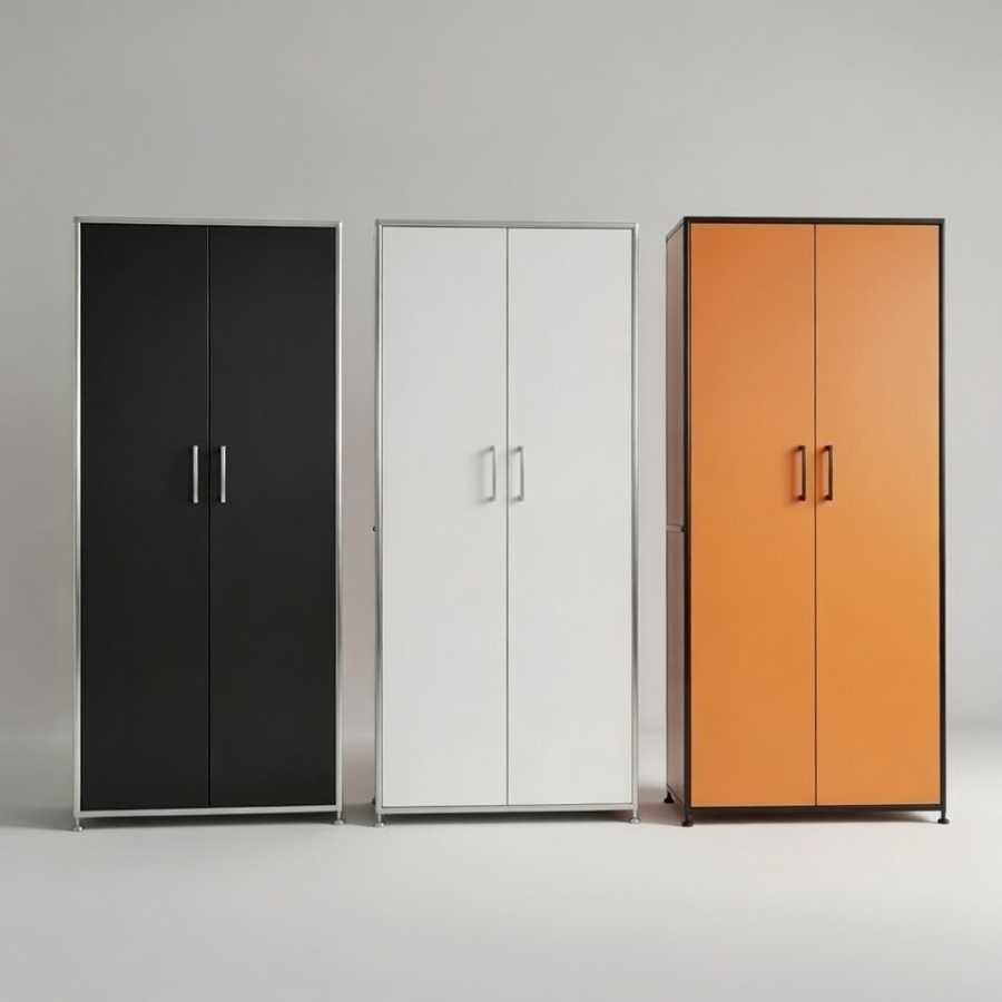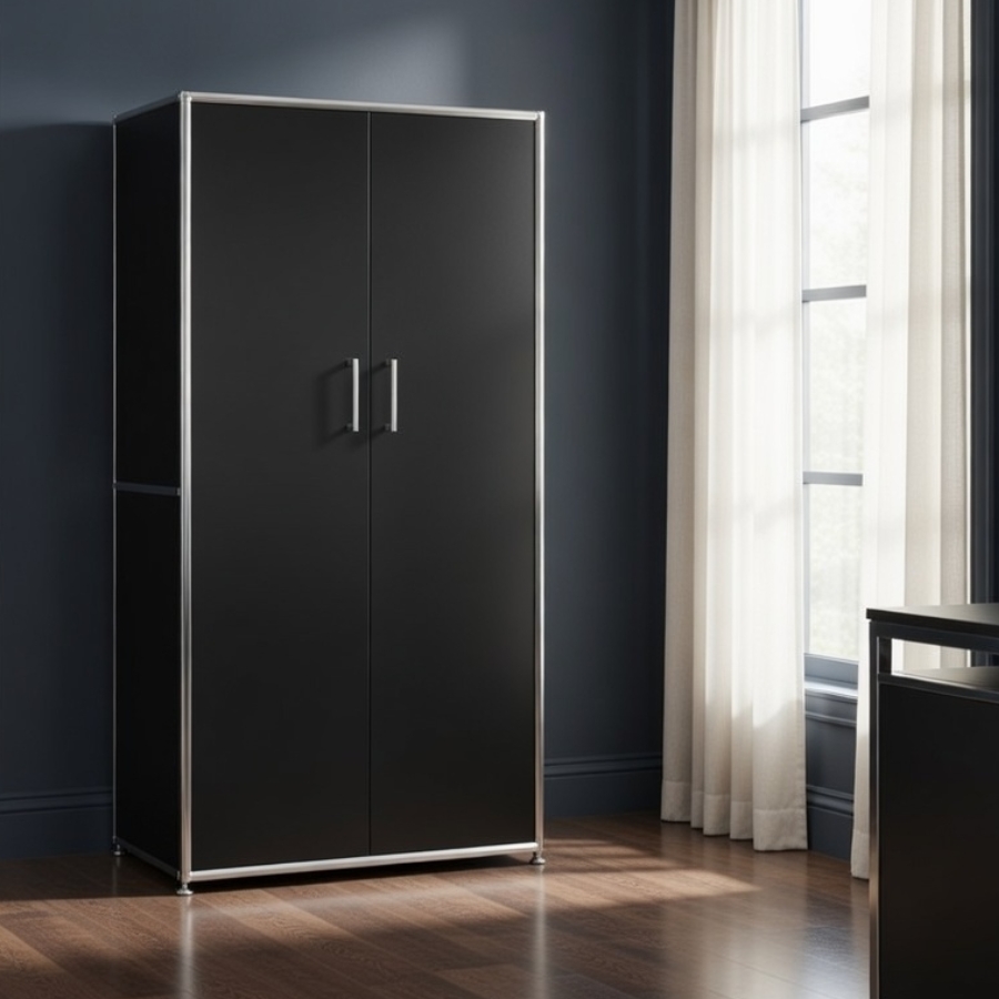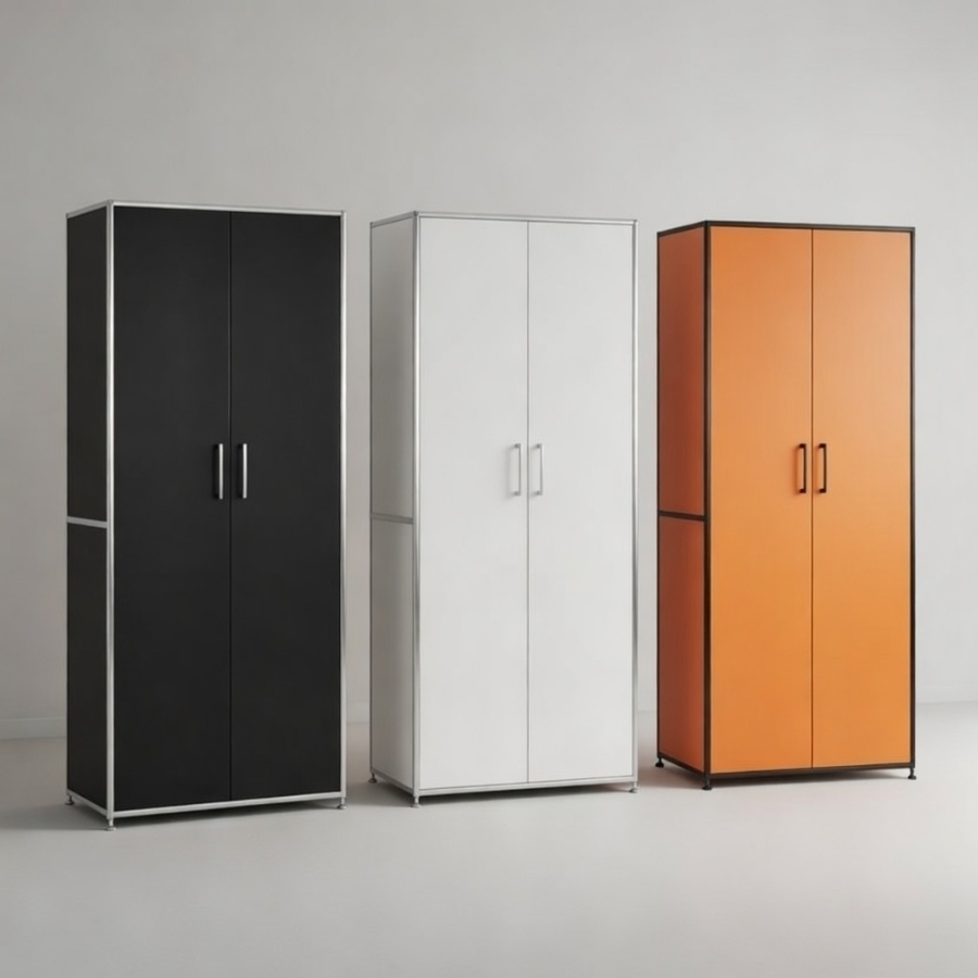 Um diese Stabilität und Flexibilität zu gewährleisten, besteht der Rahmen aus geschlossenen Systemknoten und verchromten Stahlrohren. Gegen einen Aufpreis ist es auch möglich, das jeweilige Schrankmodul mit einem Schloss zu versehen.