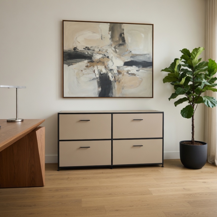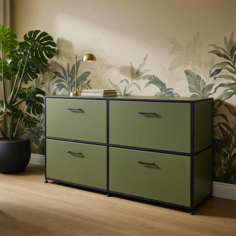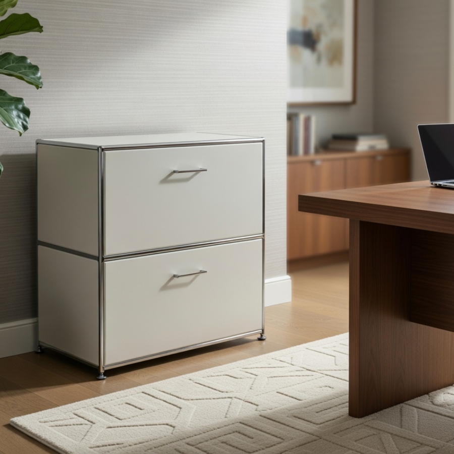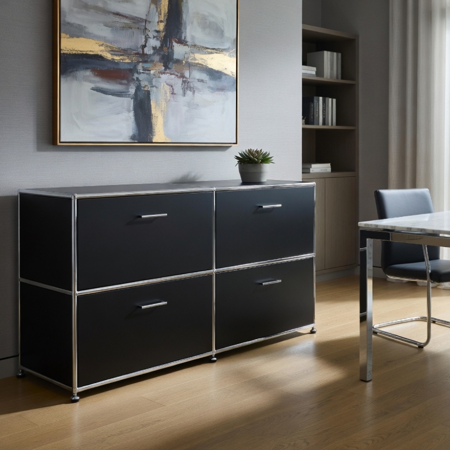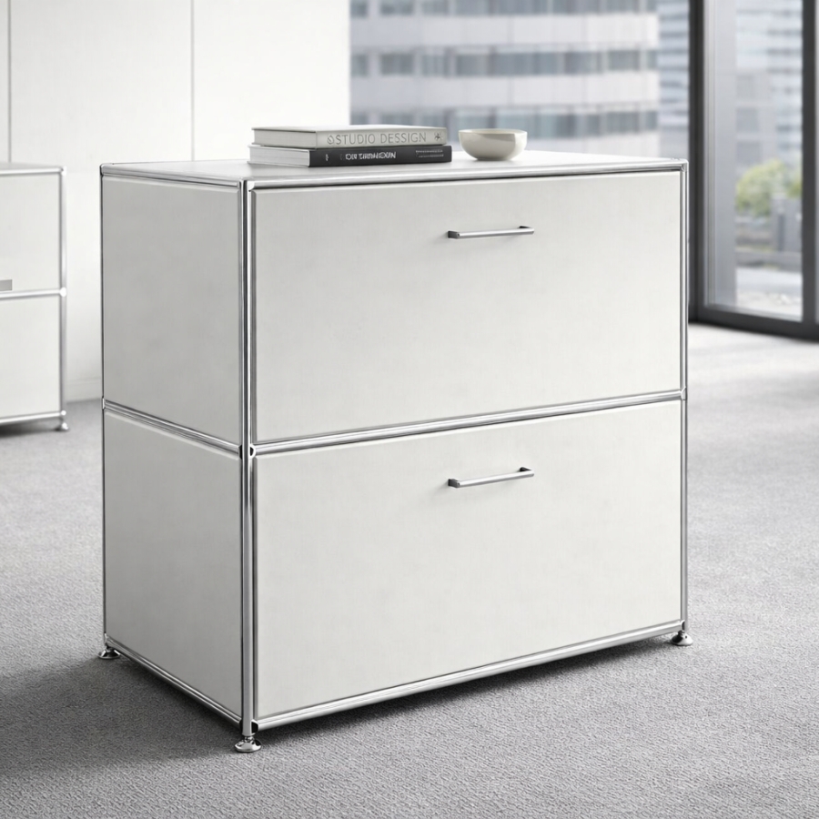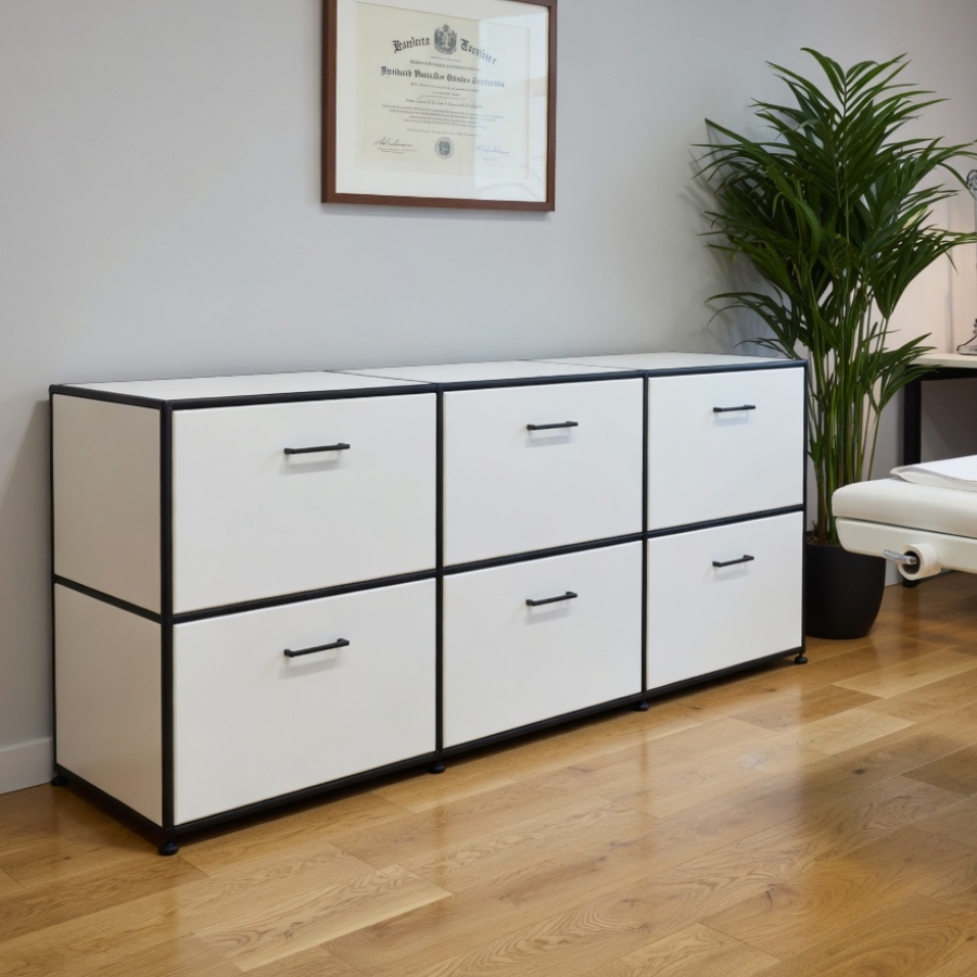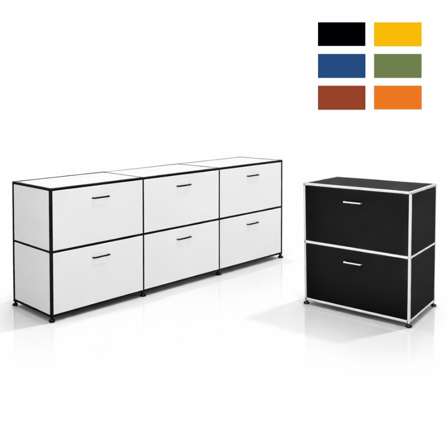Um diese Stabilität und Flexibilität zu gewährleisten, besteht der Rahmen aus geschlossenen Systemknoten und verchromten Stahlrohren. Die Kombination aus melaminbeschichteten Trägermaterial und Metall ermöglicht ein nahezu lautloses Schließen von Türen und Klappen und ebenso einen schnellen Zugriff auf ihre Unterlagen und Ordner. Gegen Aufpreis ist es auch möglich, die Klappen mit einem Schloss zu versehen.