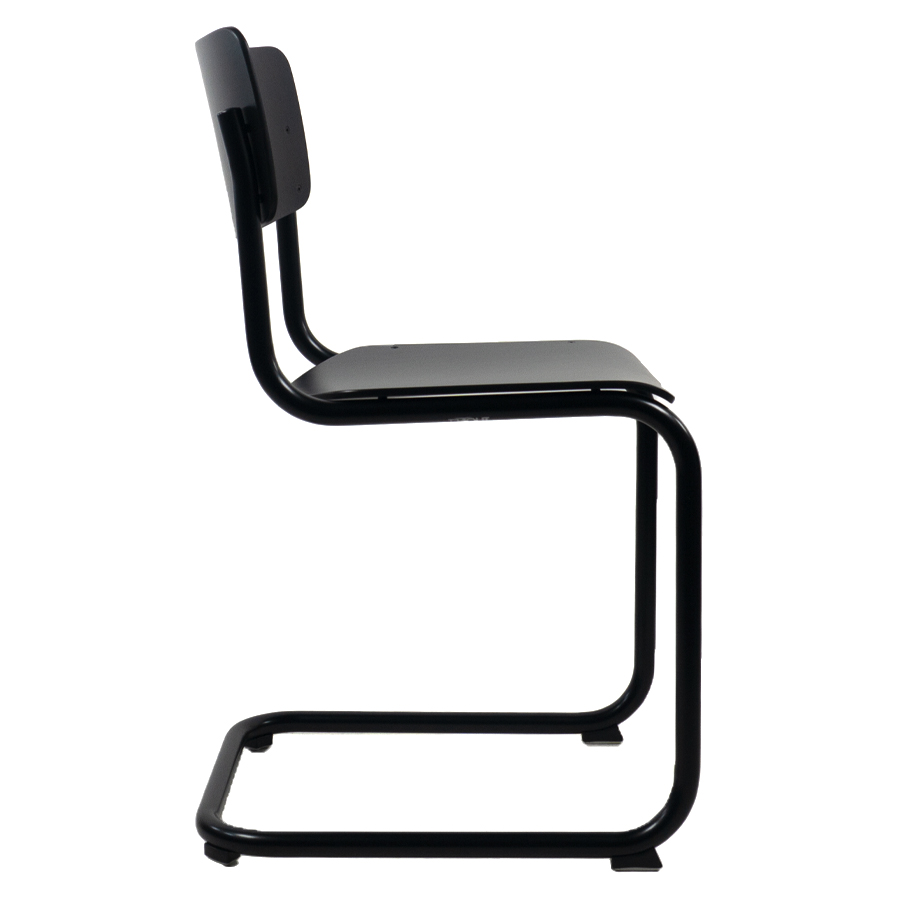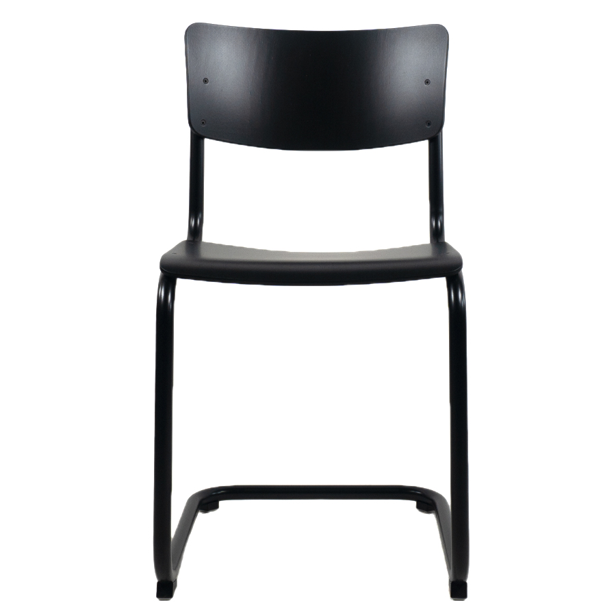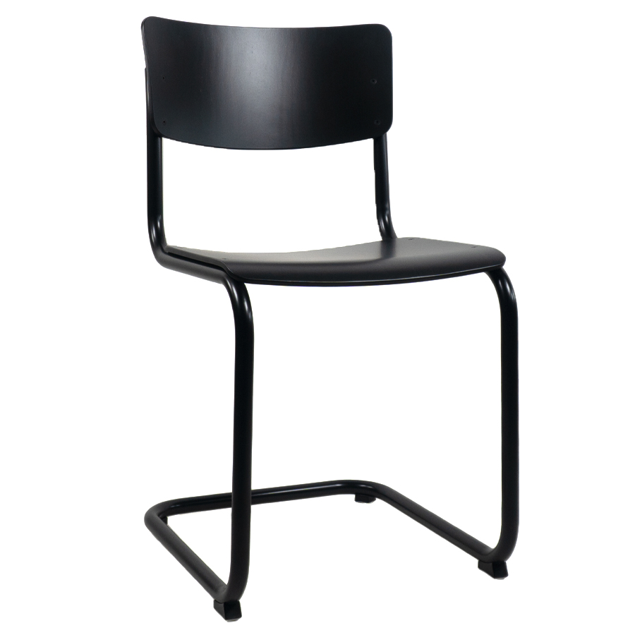 Wir bieten Ihnen hier den Stahlrohr-Freischwinger S 43 mit einem schwarz lackierten Gestell an. Die Sitz- und Rückenfläche ist aus deckend gebeizter Buche in Schwarz.