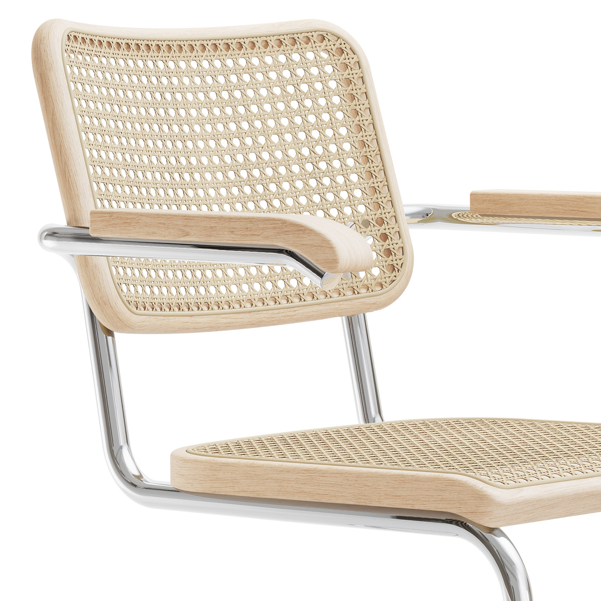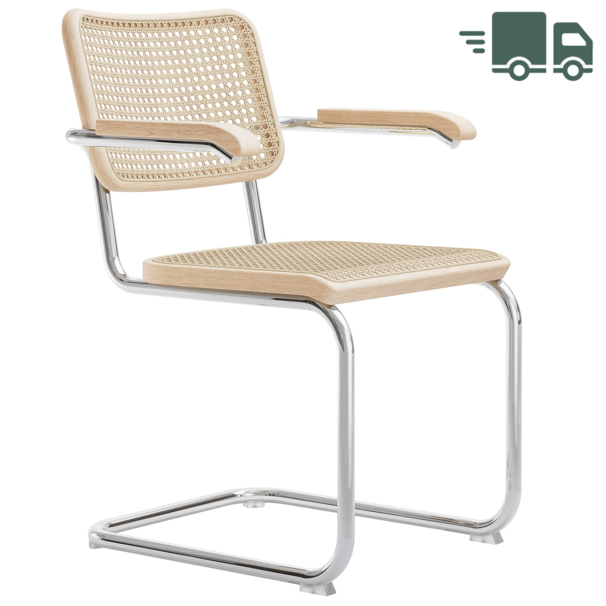 Wir bieten Ihnen hier den Stahlrohr-Freischwinger S 64 V mit einem Sitz-Rohrgeflecht, Armlehnen und verchromtem Gestell an. Der Holzrahmen am Sitz, Rücken und die Armauflagen sind aus Esche Pure Materials.
