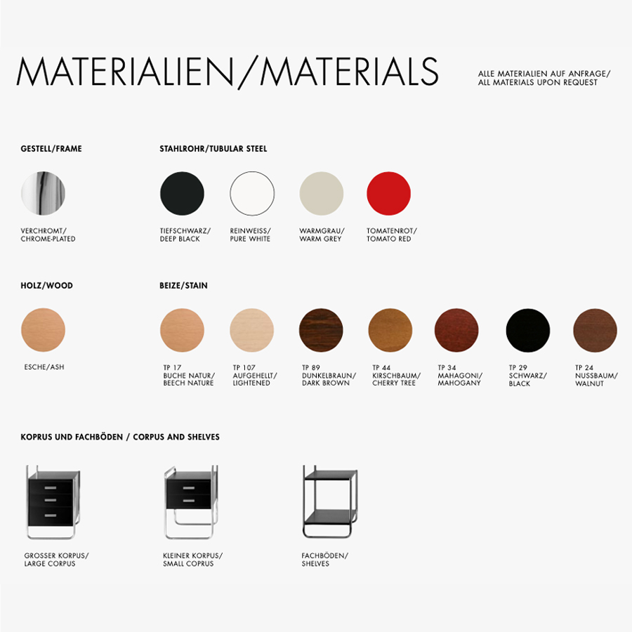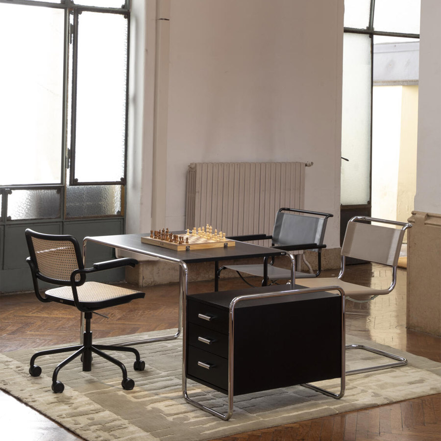 Als gelernter Tischler verband Breuer dabei sein Wissen um den Werkstoff Stahlrohr mit seinen Erfahrungen aus der Innenarchitektur. In den Rahmen aus gebogenem Stahlrohr fügen sich Tischplatte und Aufbewahrungselemente aus lackiertem oder gebeiztem Holz harmonisch ein.
