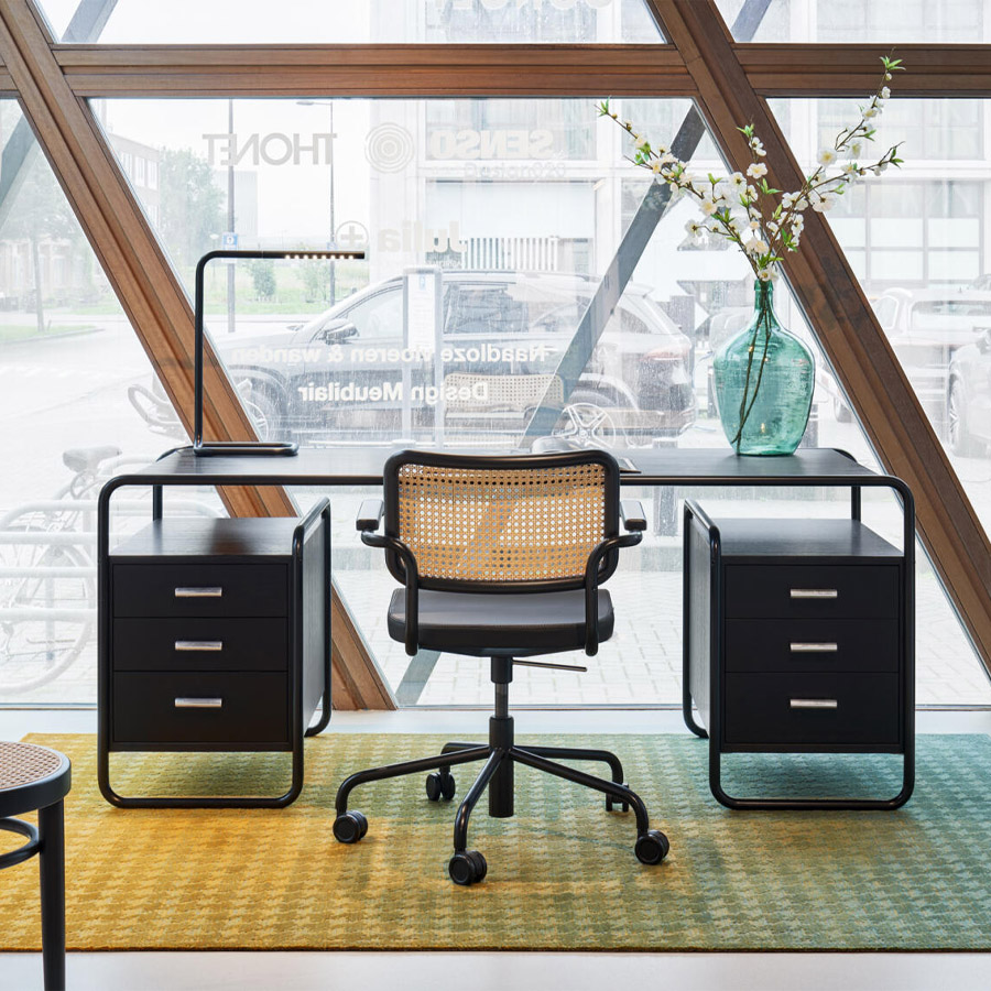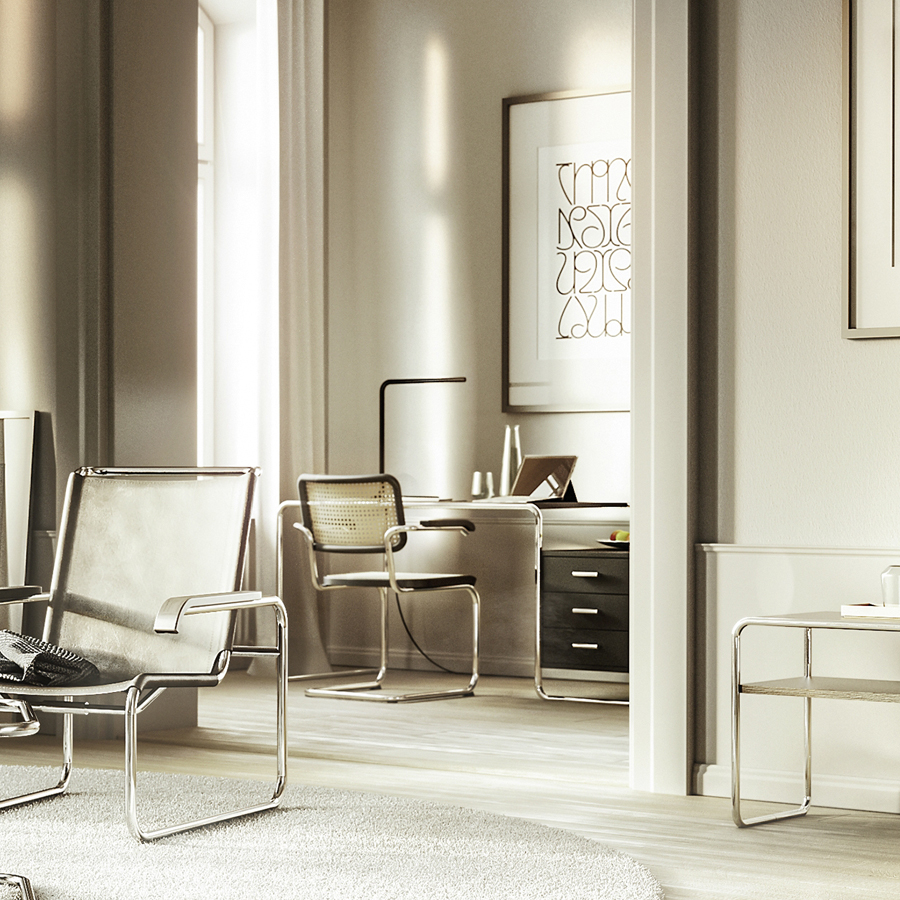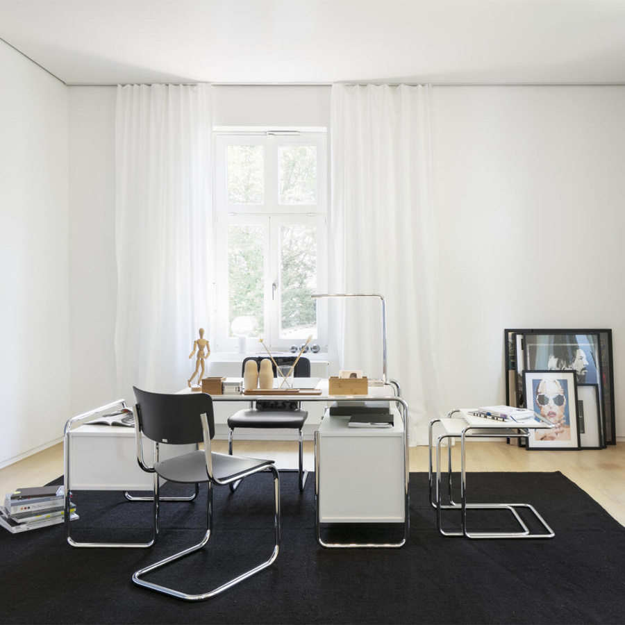Der Stahlrohr-Schreibtisch S 285: ein bedeutendes Stück Zeitgeschichte. Als hätte Marcel Breuer Homeoffice und mobile Computer unserer Tage vorausgeahnt: Sein kompakter Stahlrohr-Schreibtisch ist ein eleganter Begleiter für den aktuellen Lebens- und Arbeitsstil. Der für Thonet entworfene Schreibtisch ist ein gelungenes Beispiel für den programmatischen Anspruch des Bauhauses, Kunst und Technik zu einer neuen Einheit zu verbinden.