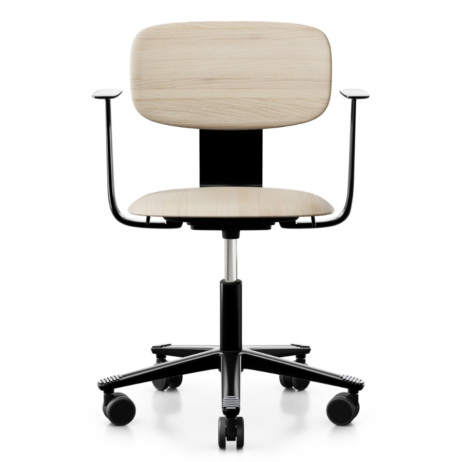 Der Sitz und die Rückenlehne des HÅG Tion 2200 sind aus Holz gefertigt (Esche aus verantwortungsvoller Forstwirtschaft). In Verbindung mit Kernkomponenten aus 97–98% recyceltem Aluminium ist HÅG Tion 2200 eine ausgezeichnete nachhaltige Wahl, da insgesamt 77% recycelte und erneuerbare Materialien enthalten sind. Die Armlehnen sind optional erhältlich.