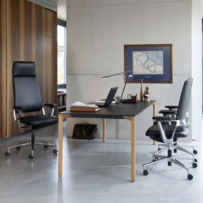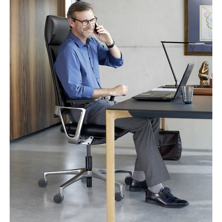 Die patentierte Automatikmechanik, die exzellente Verarbeitung, das klare Design sowie die automatisch reagierenden Funktionen sorgen ganz einfach für bewegtes Sitzen. Neben dem Bezug in Stoff oder edlem Leder, ist auch der Rückenlehnenbügel beim Connex2 Highback individuell wählbar. Das prägnante Gestaltungselement gibt es in Alu poliert oder schwarz.