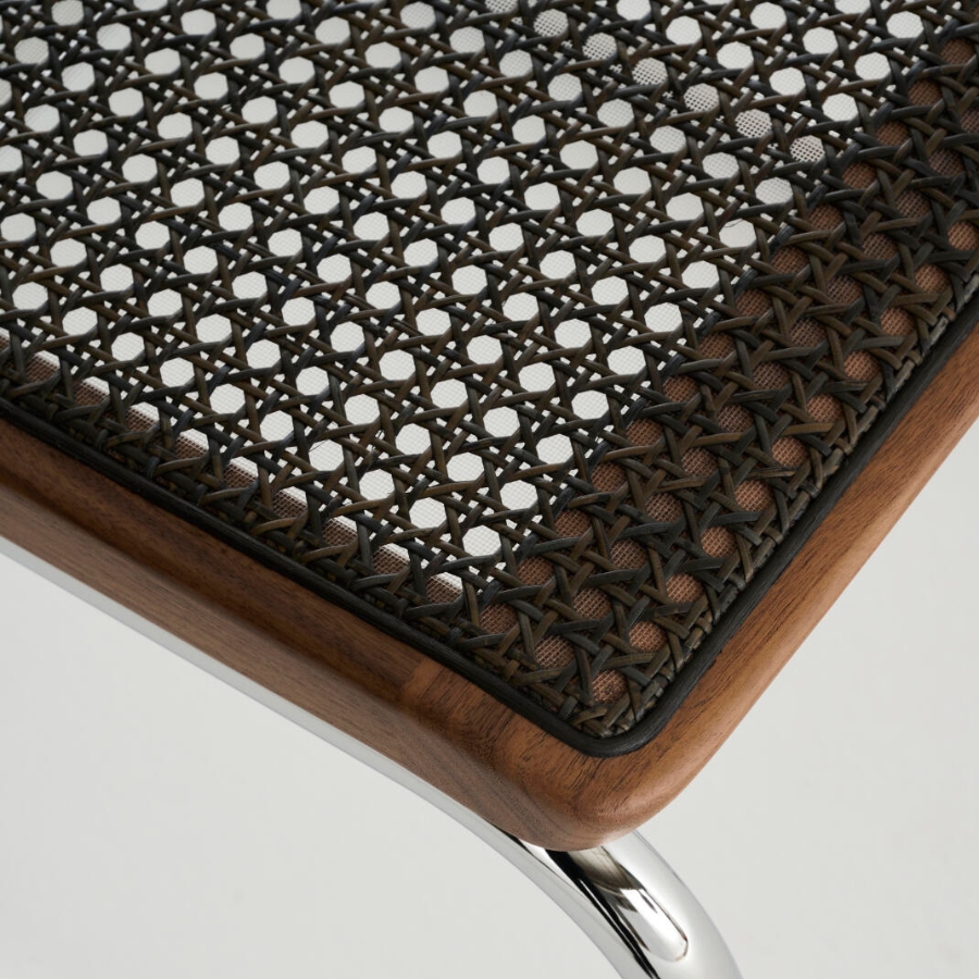Wir bieten Ihnen hier den Stahlrohr-Freischwinger S 32 V mit einem Sitz-Rohrgeflecht dunkel (Dark Melange) und verchromtem Gestell an. Der Holzrahmen an Sitz und Rücken ist aus Nussbaum Pure Materials (Nussbaum mit Naturholzlack lackiert).