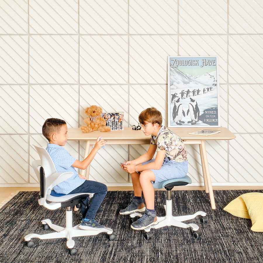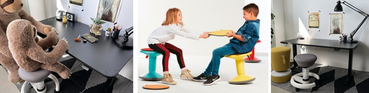 Eltern stehen manchmal vor der Frage, ob ein Schreibtischstuhl für Kinder ohne Rollen die bessere Wahl ist. In ihrem Übermut neigen Kinder gerne dazu, auf einem mit Rollen ausgestatteten Stuhl durch den Raum zu sausen, wobei schnell Missgeschicke passieren können. Auch kann ein Stuhl mit Rollen beim Hinsetzen schnell mal wegrollen. Unter diesem Gesichtspunkt ist ein Schreibtischstuhl für Kinder ohne Rollen die sicherere Wahl: Diese Modelle sind mit Stuhlgleitern ausgestattet, die für ein ruhigeres Sitzverhalten sorgen. Entscheiden Sie sich für einen Schreibtischstuhl mit Rollen, sollten diese zum Bodenbelag passen. Harte Rollen eignen sich für Teppichböden, während weiche Rollen für harte Böden wie Laminat, Fliesen und Linoleum vorgesehen sind. Ideal sind Universalrollen, die gut auf allen Böden genutzt werden können. Der Schreibtischhocker Aeris Swoppster verfügt übrigens über Gleiter und Rollen, die wahlweise montiert werden können.