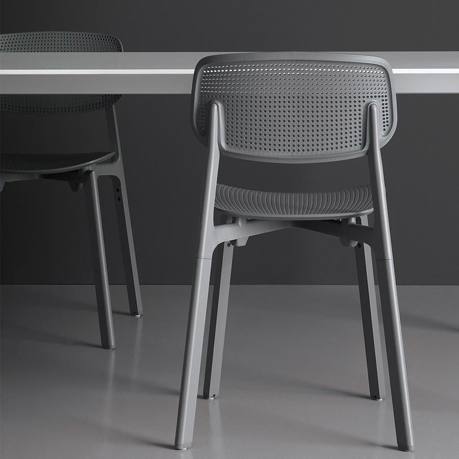 Die charakteristische, perforierte Sitz- und Rückenfläche ist nicht nur ein prägnantes Designmerkmal, sondern sorgt auch für eine angenehme Luftzirkulation beim Sitzen. Dadurch entsteht selbst bei längerem Verweilen ein hoher Sitzkomfort – ideal für Esszimmer, Küche oder Büro.