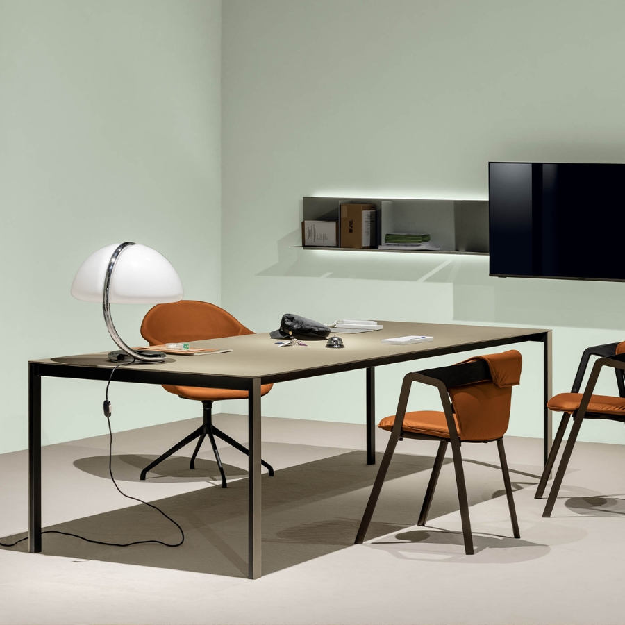Der Tisch Thin-K nach einem Entwurf von Luciano Bertoncini wird ganz aus Metall hergestellt, mit außenliegenden Details und Platte aus Aluminium, glänzendem oder mattem Glas oder aus Aluminium mit Holzfurnier – alles widerstandsfähige, langlebige und vollständig recycelbare Materialien. Die leicht strukturierte Ausführung der Platte aus Aluminium machen diese angenehm glatt und berührungsfreundlich. Der Fixe oder verlängerbare Tisch Thin-K steht in verschiedenen Farben zur Auswahl.