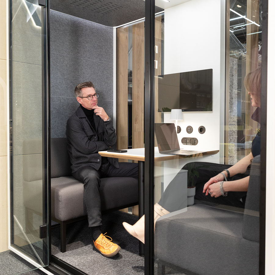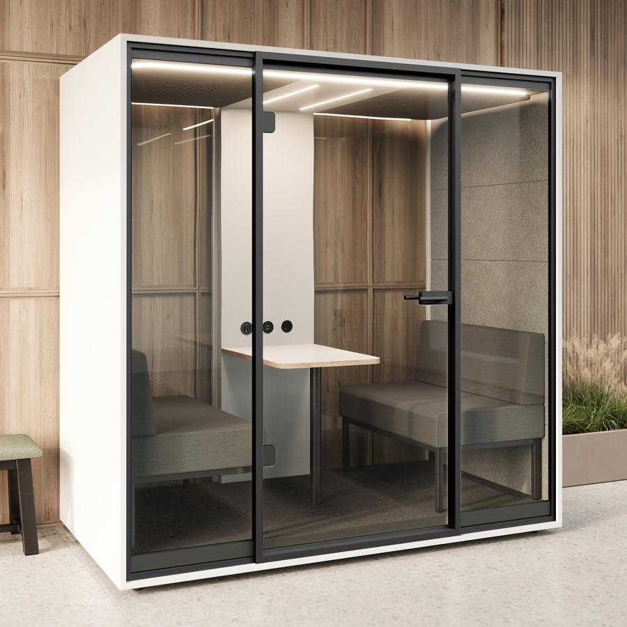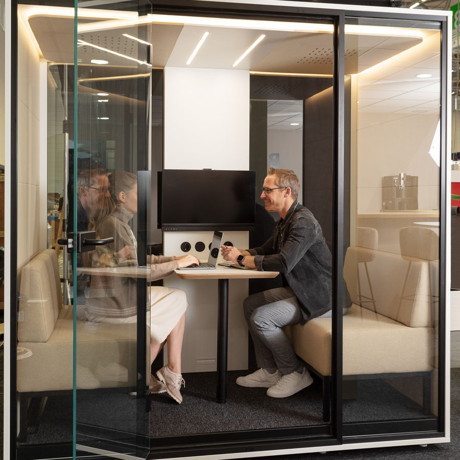 Die RWH Meetingbox Chat bietet genügend Raum für zwei Personen, um gemeinsam bequem zu arbeiten und Gespräche zu führen. Der integrierte Tisch aus Birkenschichtholz bietet Ihnen eine praktische Arbeitsfläche, ideal für Laptops und Unterlagen. Die moderne Beleuchtung sorgt für angenehmes Licht und schafft eine produktive Umgebung.