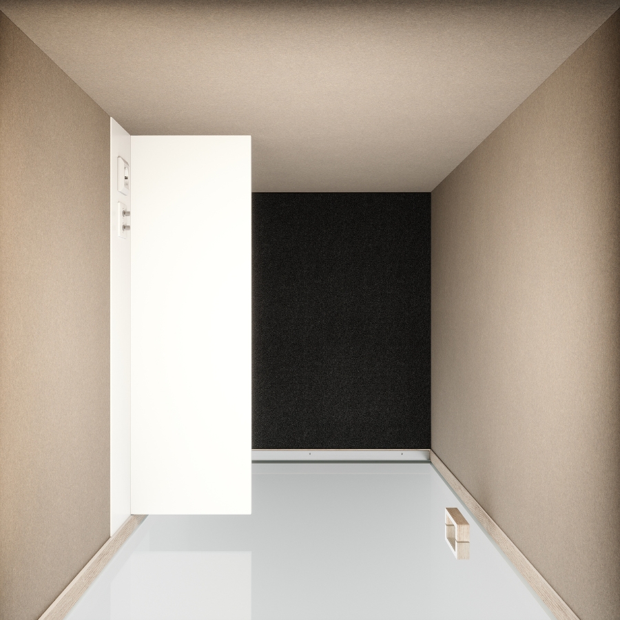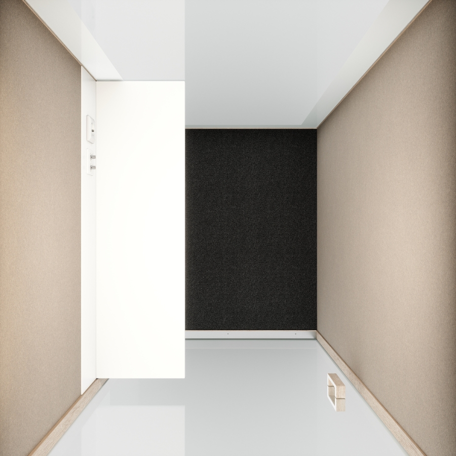 Innen überzeugt die Cube 1 mit einer edlen Verkleidung aus echtem Wollfilz, die nicht nur schallabsorbierend wirkt, sondern auch eine warme, natürliche Atmosphäre schafft. Der robuste Melaminkorpus, die Glasfront und optionale Glasrückwand unterstreichen das hochwertige Erscheinungsbild.