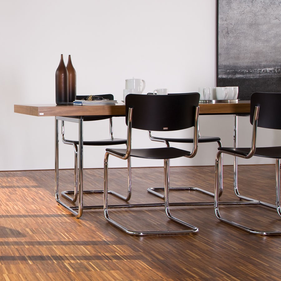 Die außergewöhnliche Kombinationsfreude von Nussbaum ist eines der stärksten Argumente für dieses Holz. Die warme, dunkle Optik harmoniert mit nahezu jedem Untergestell und fügt sich in unterschiedlichste Einrichtungsstile ein.