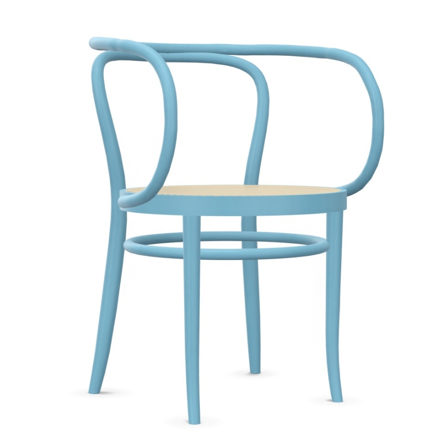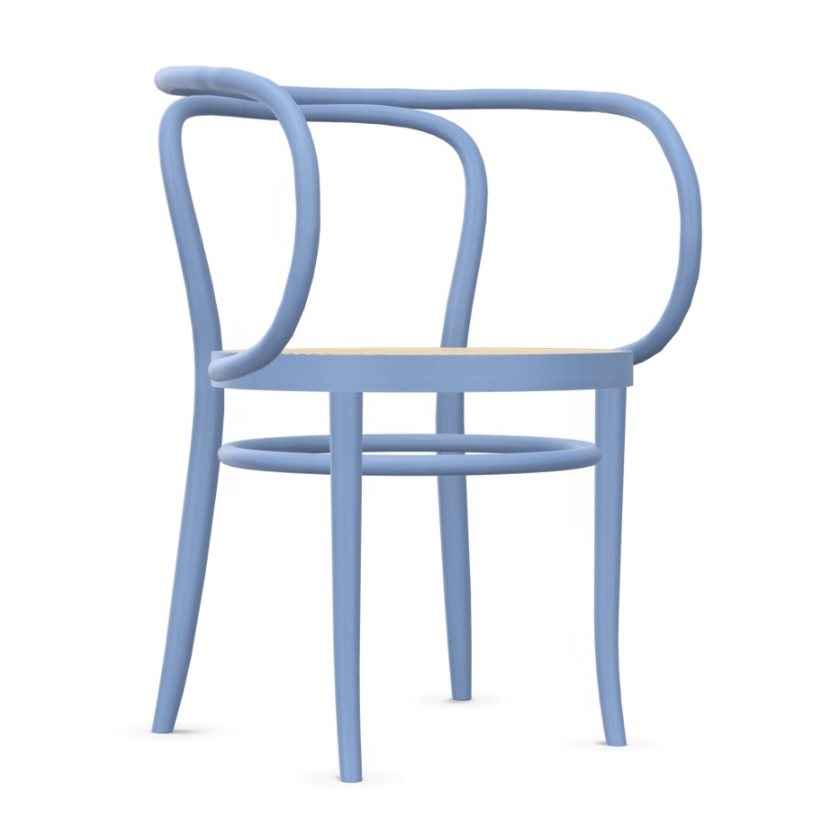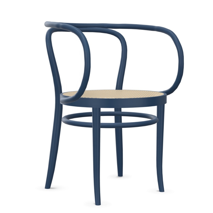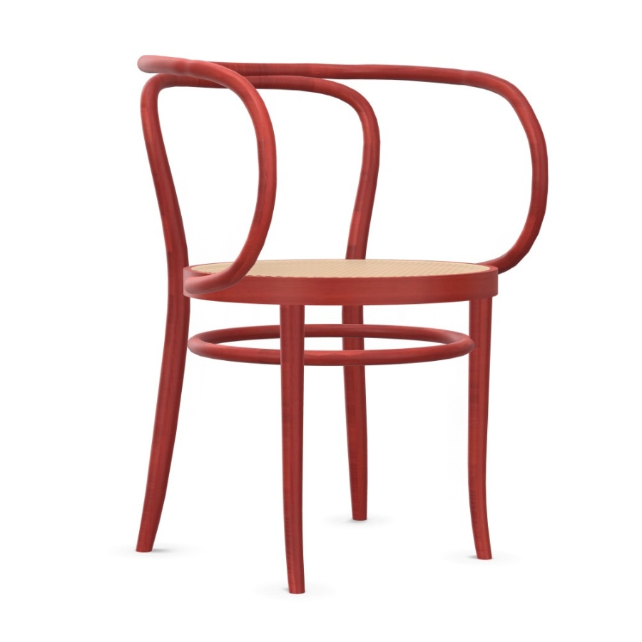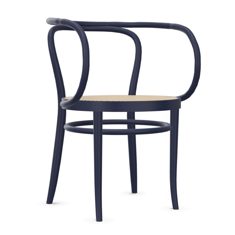 Dieser elegante Bugholz-Klassiker ist ein Meisterwerk in Konstruktion und Fertigung: Der ausladende Bügel, der Rücken- und Armlehne zugleich bildet, wird in einem Stück aus massivem Buchenholz in seine Form gebogen. Wie das Urmodell der Bugholzstühle, Modell Nr. 214, besteht der 209 ebenfalls nur aus sechs Teilen.