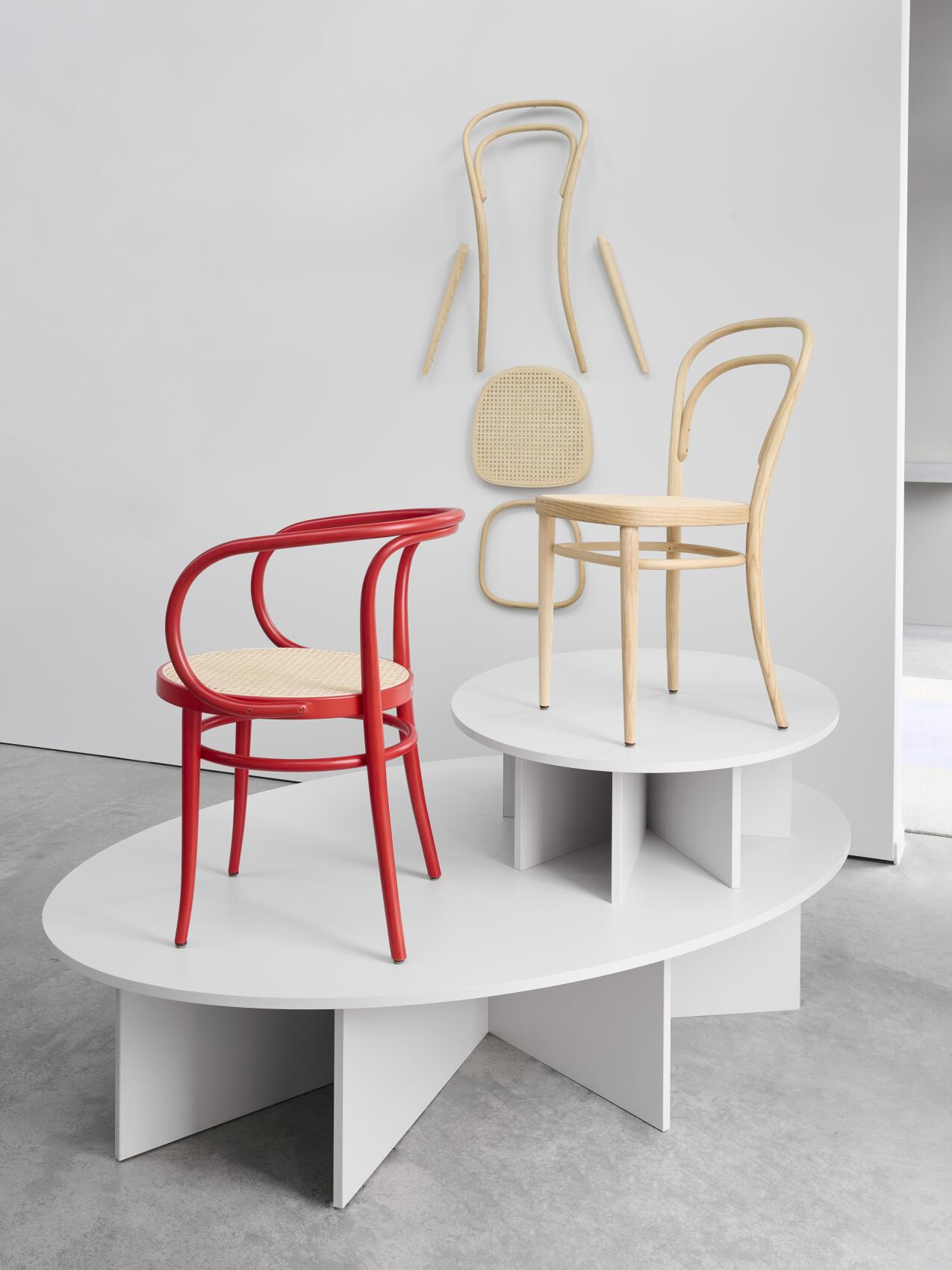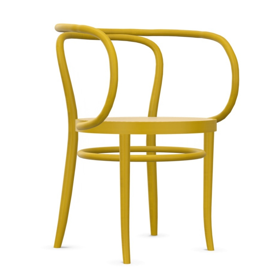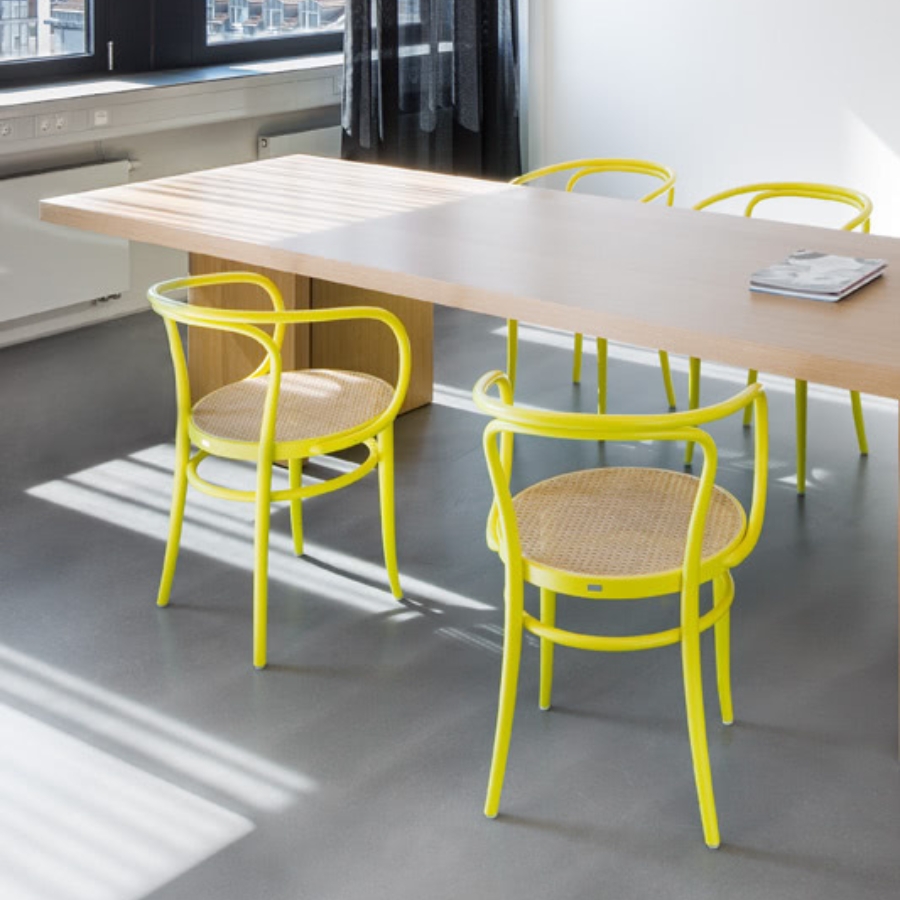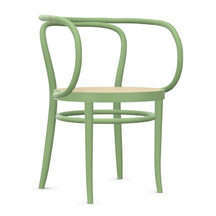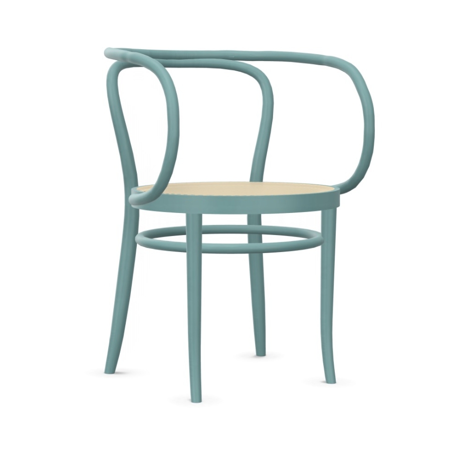 Dieser elegante Bugholz-Klassiker ist ein Meisterwerk in Konstruktion und Fertigung: Der ausladende Bügel, der Rücken- und Armlehne zugleich bildet, wird in einem Stück aus massivem Buchenholz in seine Form gebogen. Wie das Urmodell der Bugholzstühle, Modell Nr. 214, besteht der 209 ebenfalls nur aus sechs Teilen.