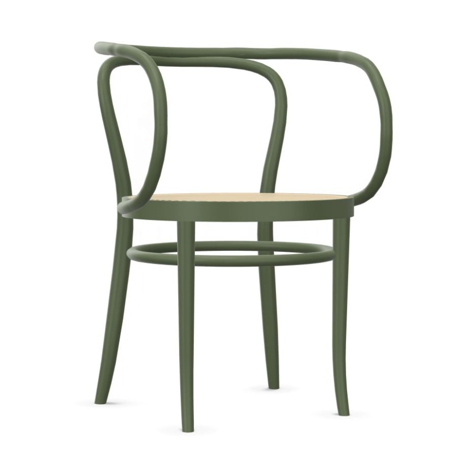 Wir bieten Ihnen hier den Thonet Bugholzarmlehnenstuhl 209 mit einem verstärkten Sitz-Rohrgeflecht an. Der Holzrahmen ist bei dieser Ausführung aus Buche gebeizt in Olivgrün.