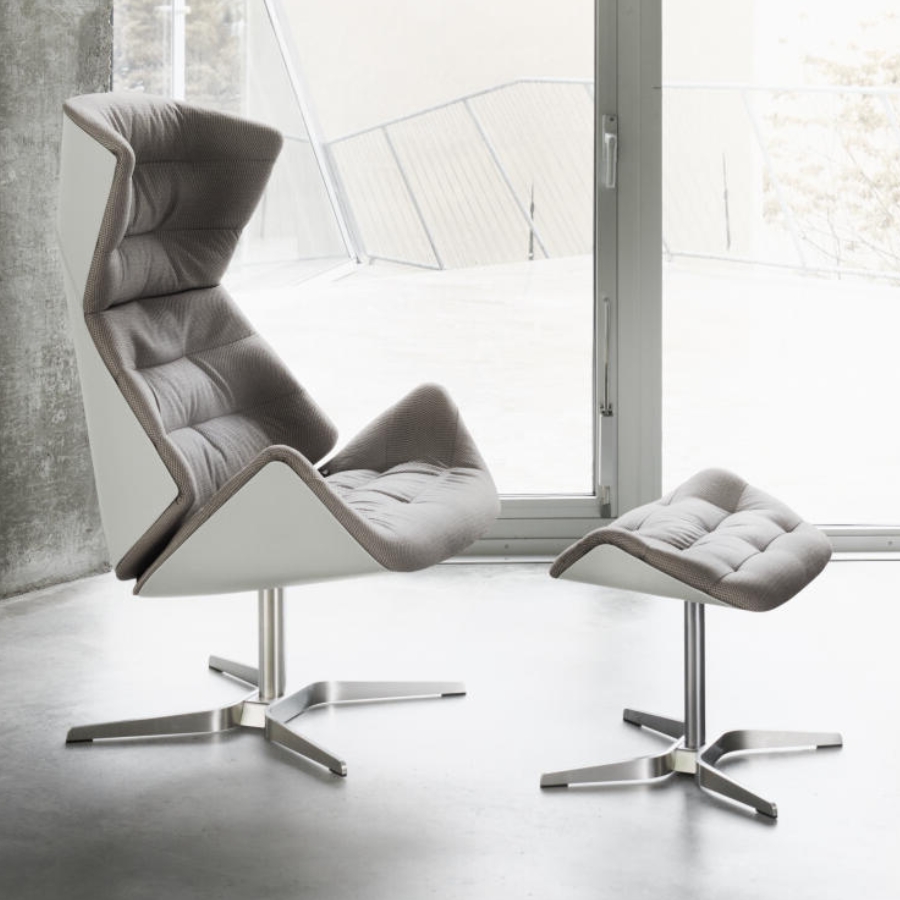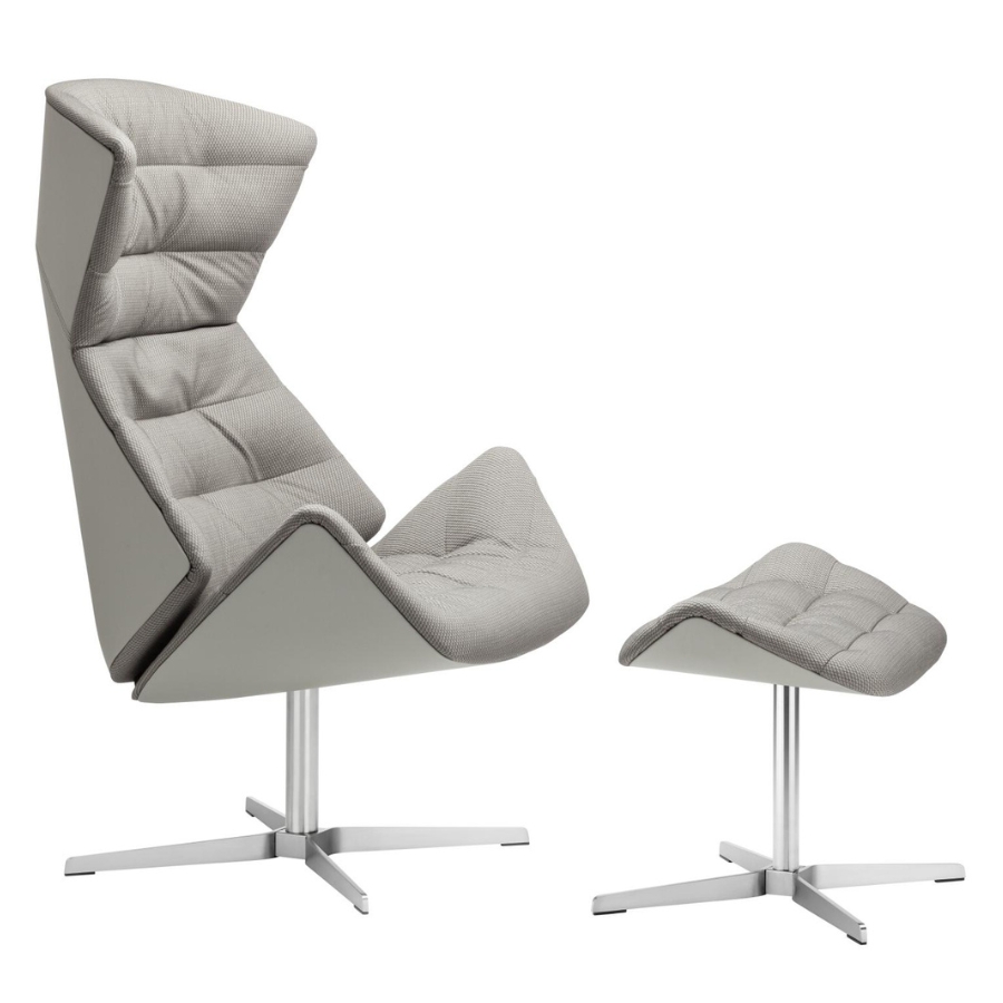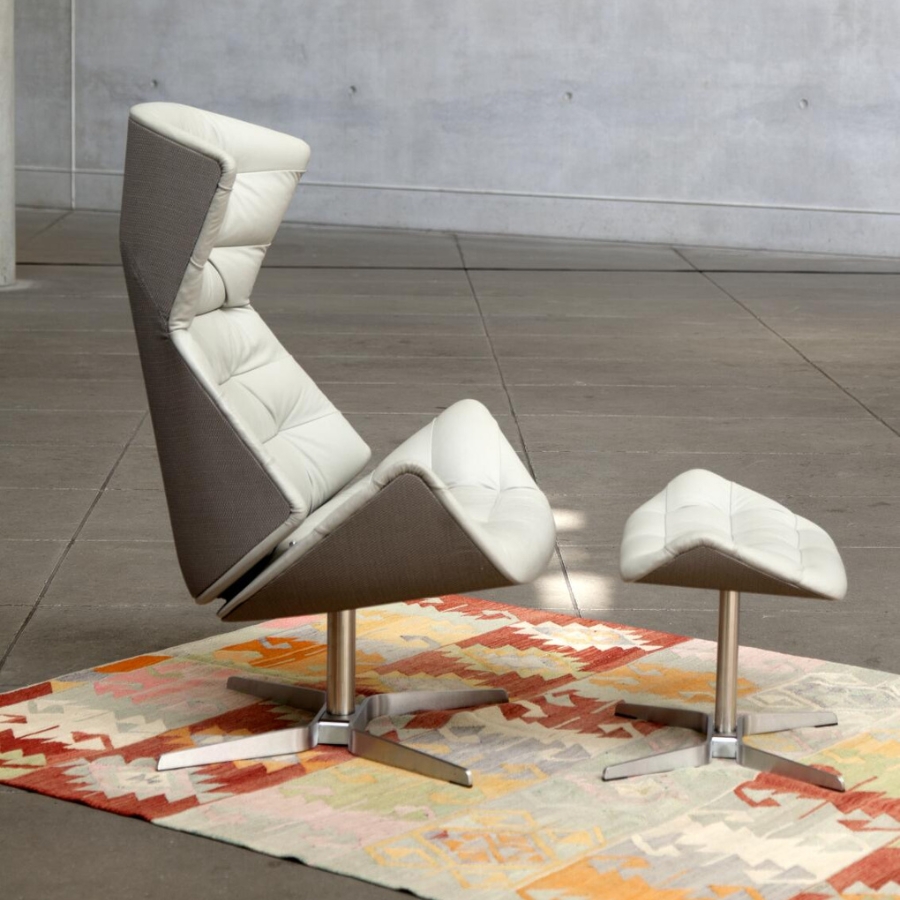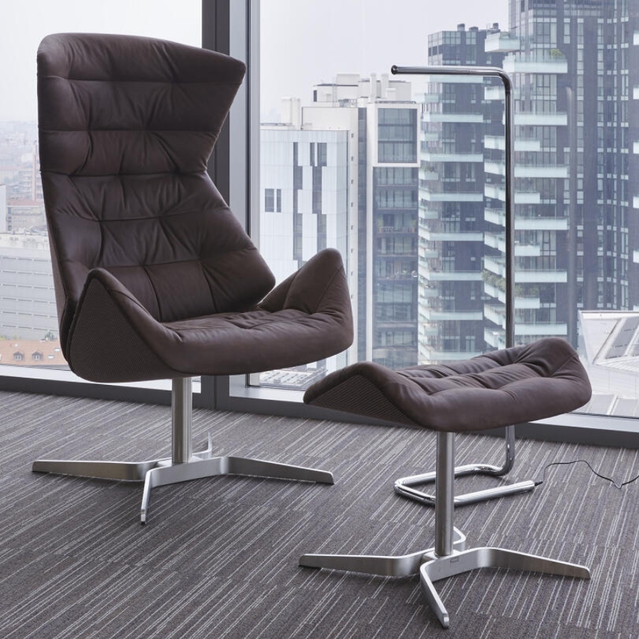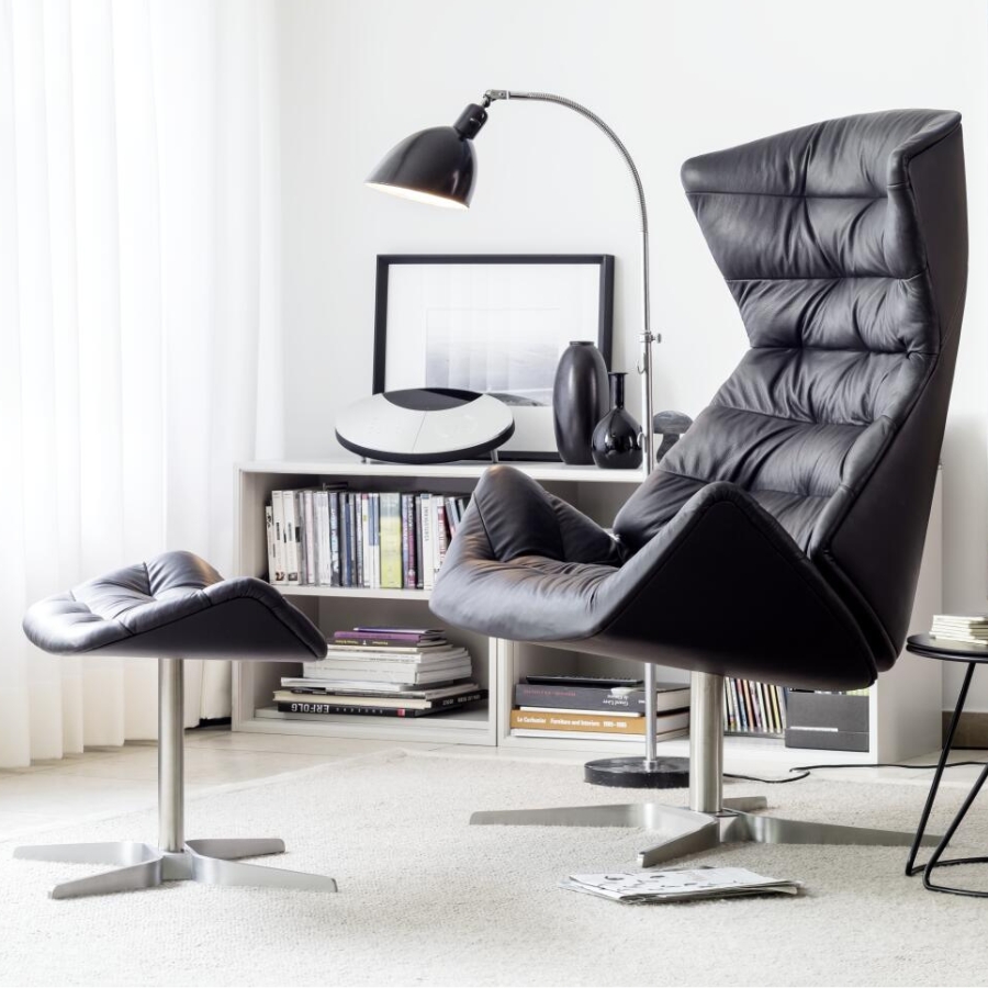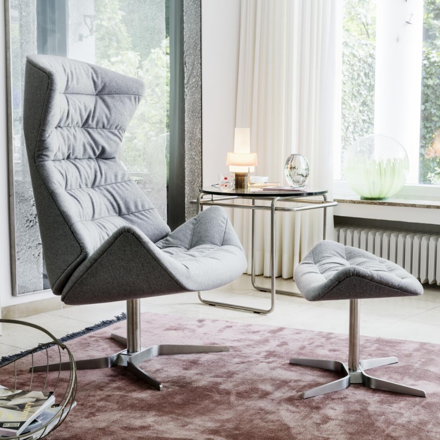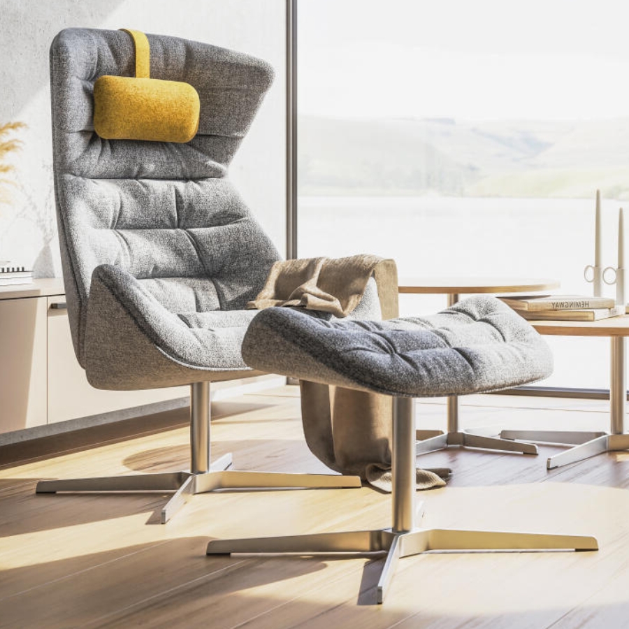 Darüber hinaus ermöglicht eine intelligente Verstellmechanik dem Nutzer die individuelle Anpassung des Sessels. Das Programm wird durch einen Fußhocker abgerundet. Für ein zusätzliches Mehr an Komfort kann auf Anfrage ein Nackenkissen ergänzt werden. Ein integriertes Gegengewicht ermöglicht eine flexible Positionierung, wodurch der Kopf der sitzenden Person ideal gestützt wird. In zahlreichen Bezügen – von Textil bis hin zu Leder – verfügbar, setzt auch das Kissen optische Akzente in Kontrastfarben oder fügt sich stimmig in die umarmende Sitzschale des bequemen Loungers ein.