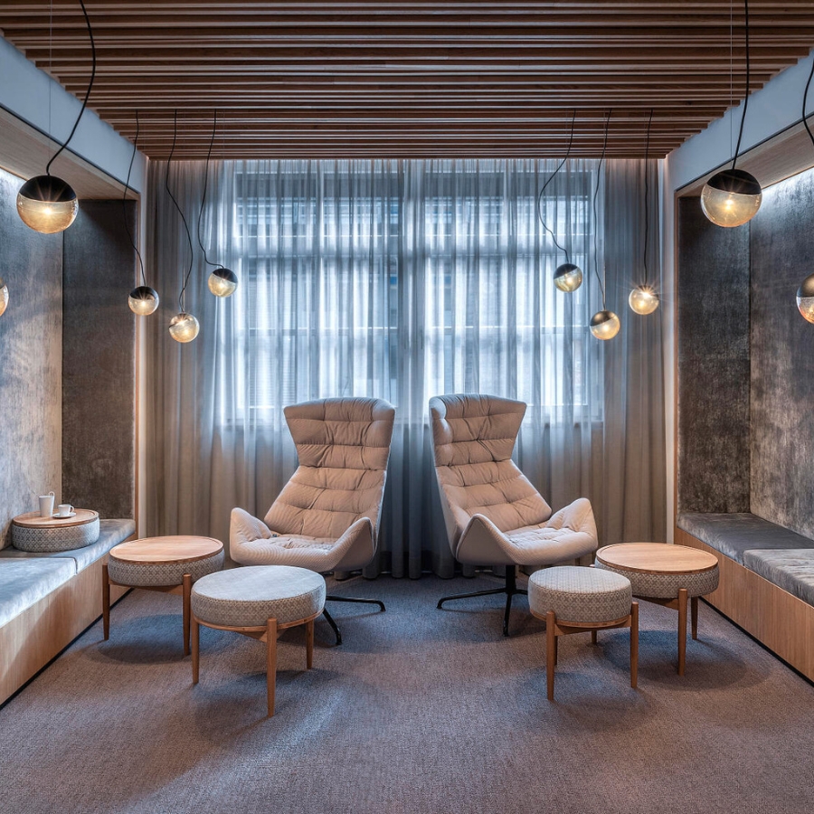 Mit dem THONET 808 hat das Münchner Designstudio Formstelle einen Lounge-Sessel entwickelt, der maximalen Komfort mit zahlreichen Möglichkeiten zur Individualisierung verbindet. Der Sessel spielt mit dem Kontrast zwischen schützender Hülle und Offenheit. In seiner Umgebung bietet er einen Ort des Rückzugs und der Ruhe. Seine charakteristische Anmutung entsteht durch eine konsequente Neuinterpretation des klassischen Ohrensessels – das obere Rückenteil erinnert an einen schützenden Kragen. Die Schale umfängt den Sitzenden und vermittelt Geborgenheit. Das zweite markante Merkmal ist die bequeme, an Wellen erinnernde Polsterung. Die Innenseite mit der lockeren Kissenoptik steht im spannungsvollen Gegensatz zur glatten Außenschale.