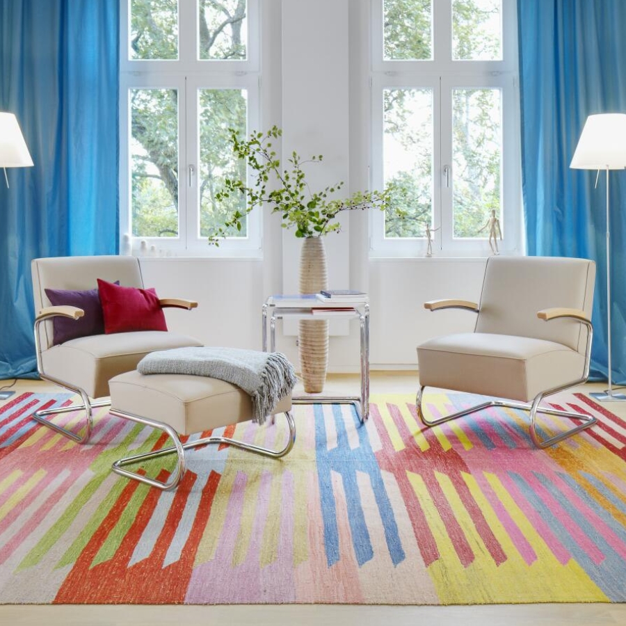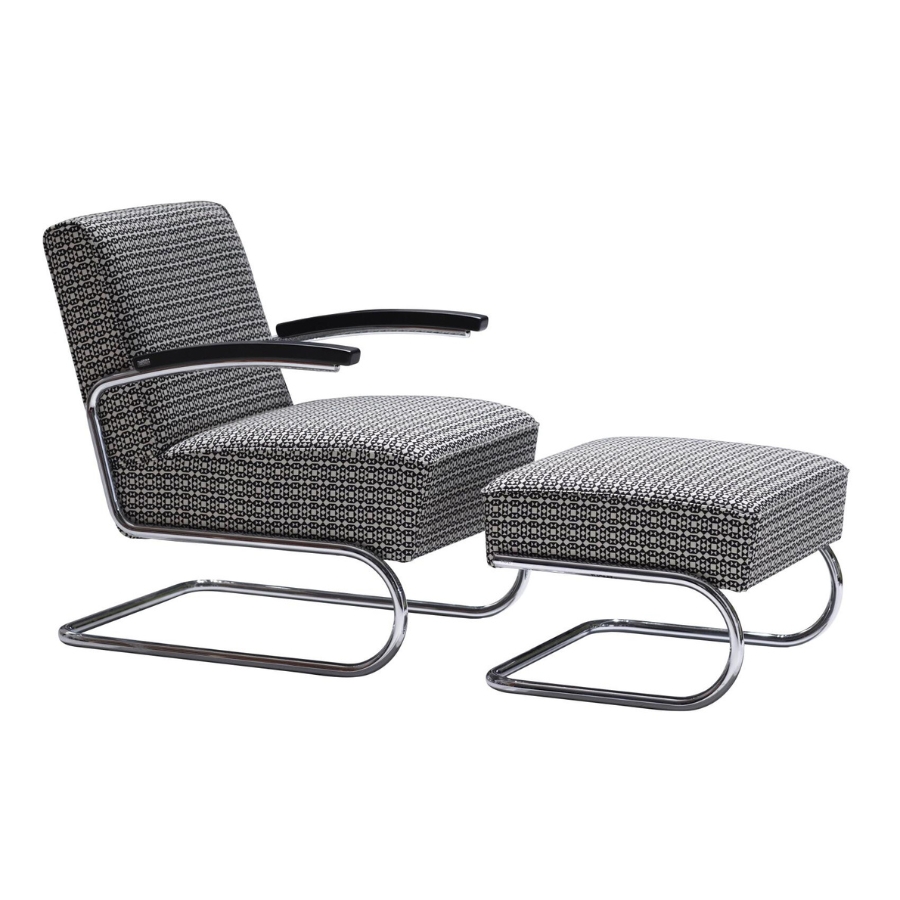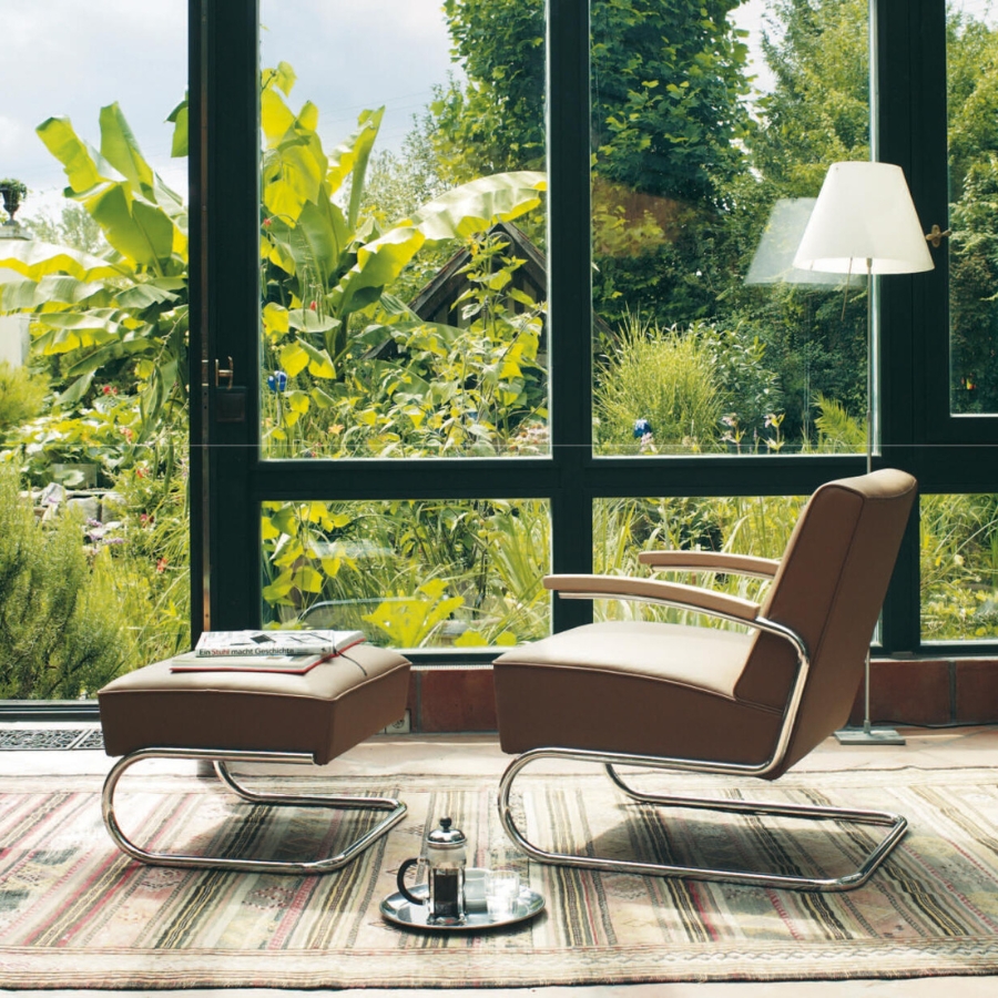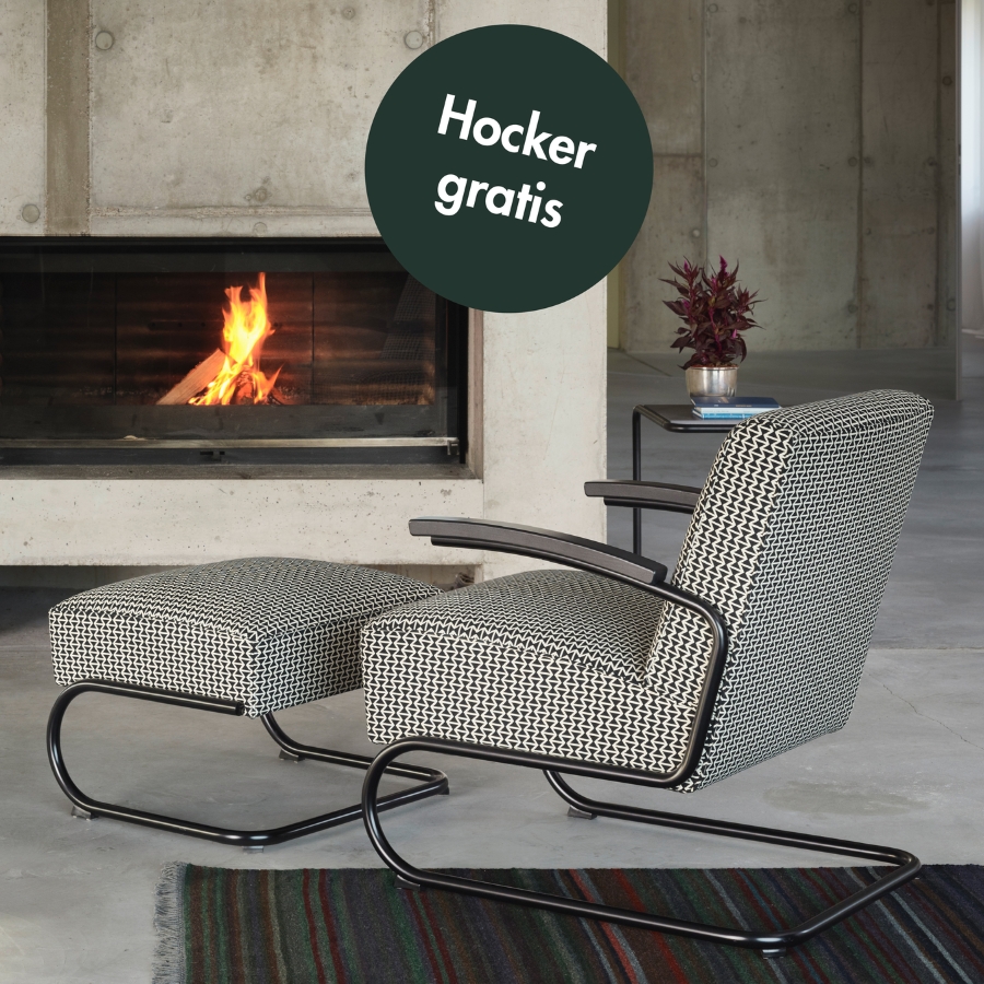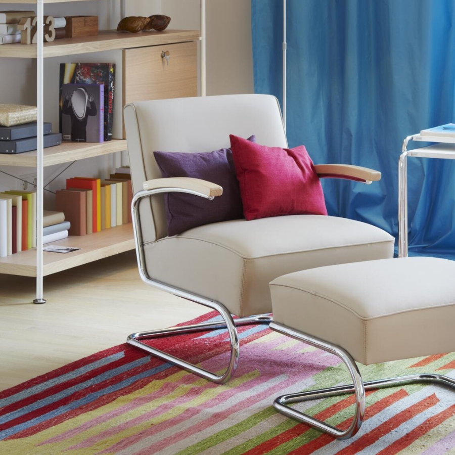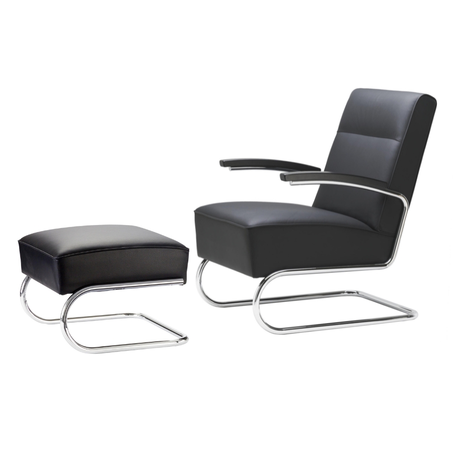 Die herausragenden Eigenschaften dieses Sessels sind Eleganz, Zeitlosigkeit und hoher Sitzkomfort. Dazu kommt eine Leichtigkeit, über die nur ein Freischwingermodell verfügt. Während die ersten Stahlrohr-Stühle aus den 1920er Jahren kaum mit Polstern versehen waren, taucht im Thonet-Katalog von 1935 bereits eine ganze Serie voluminös gepolsterter Sessel und Sofas auf. Vermutlich markiert der Thonet-eigene Entwurf des S 411 aus dem Jahr 1932 den Beginn dieser neuen Produktreihe. Heute wird er mit einer hochwertigen Federkern-Polsterung gefertigt. Dazu bieten wir hier einen passenden Fußhocker an.