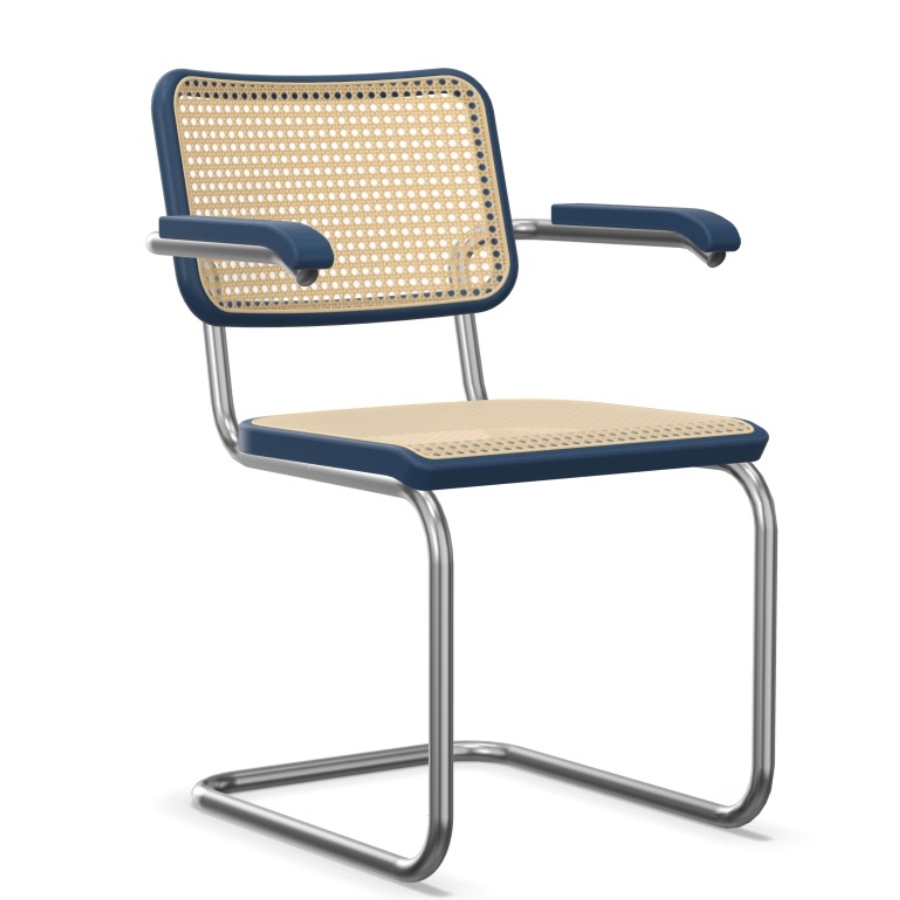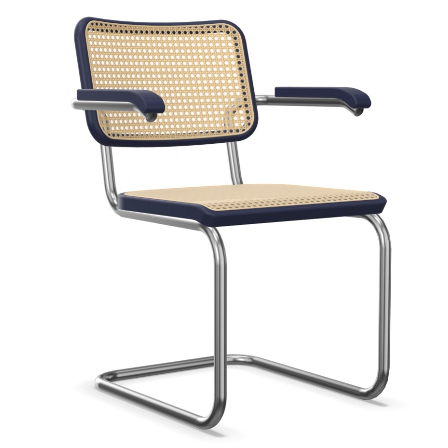 Wir bieten Ihnen hier den Stahlrohr-Freischwinger S 64 V mit einem Sitz-Rohrgeflecht, Armlehnen und verchromtem Gestell an. Der Holzrahmen am Sitz, Rücken und die Armauflagen sind aus gebeizter Buche - wir bieten hier nur eine Auswahl an Farben an. Fragen Sie gerne nach weiteren Farben.