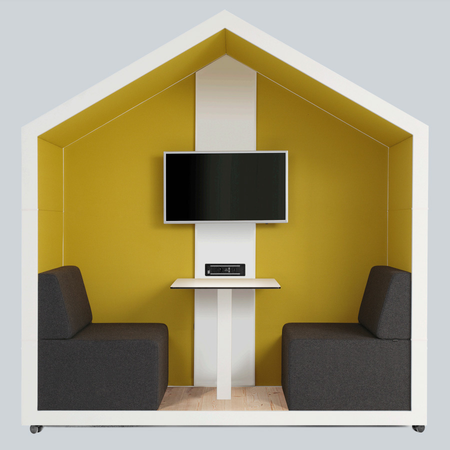 Treehouse wurde geschaffen, um eine Atmosphäre wie im Kinderspiel – gemütlich und sicher, aber zugleich äußerst funktional – zu spüren bekommen. Die Form erinnert an Baumhäuser, in denen Teampartnerschaften leicht entstehen und die kreativsten Ideen generiert werden. Dank den Treehouse-Schallschutzkabinen kann man einen Raum abtrennen, der ein wenig Erholung von der umgebenden Hektik und dem Lärm bietet. Es ist ein idealer Ort für Treffen in einem kleineren Kreis, in stiller Atmosphäre. Ist man von der umgebenden Welt isoliert, kann man in Ruhe arbeiten oder ein Brainstorming durchführen. Treehouse ist ein Mini-Konferenzsaal im Zentrum des Büros.
