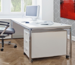 Die S-Desk Modul Space Schreibtische von Bosse Design hingegen überzeugen durch verchromte Standfüße, Rollen und Griffe. Für eine etwas kontrastreichere Optik sind auch matt gepulverte Elemente erhältlich. Melaminarbeitsflächen in wählbaren Farben lassen sich leicht pflegen und nehmen Abstand von den üblichen Gebrauchsspuren.