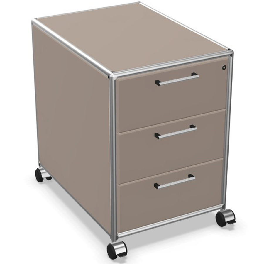 Um die Stabilität des Rollcontainers zu gewährleisten, besteht der Rahmen aus geschlossenen Systemknoten und verchromten Stahlrohren, die bündig mit den Oberflächen abschließen. Die Schubladen selbst lassen sich auch Kugelrollen-Teleskopschienen ausziehen. Dadurch sind sie besonders langlebig, weil sie sich kaum abnutzen. Die Metallgriffe jeder einzelnen Schublade bestehen ebenfalls aus Chrom.