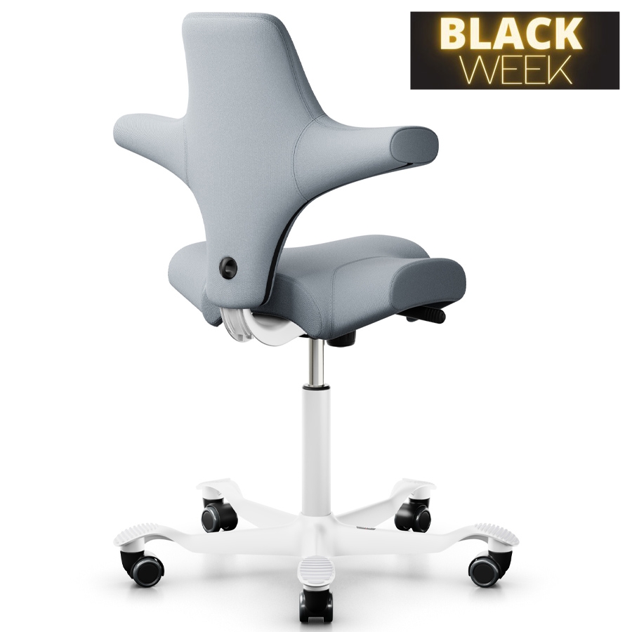 - Sattelform: Der Sitz des Capiscos ermöglicht eine Vielzahl von Sitzpositionen: Nach vorne, seitlich und rückwärts. Dies fördert Bewegung und Flexibilität am Arbeitsplatz