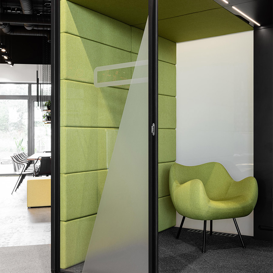AKUSTIK: Die Stoffpolsterung sowie die Glaselemente aus VSG-Glas mit Akustikfolie nehmen die Innen- und Aussengeräusche effektiv auf.