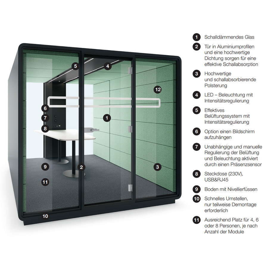 Die schallgedämmte Kabine Hushmeet.L ist eine Alternative zu den üblichen Konferenzräumen. Aufgrund ihres modularen Designs passt sie sich perfekt an den Bedarf des jeweiligen Büros an. Mittels Modulen ist eine Erweiterung der Kabine möglich. Hushmeet.L ist der ideale Raum für größere Teambesprechungen, Videokonferenzen und Projektmeetings. Sie wirkt eher wie ein komfortabler Raum als eine normale schallgedämmte Kabine.