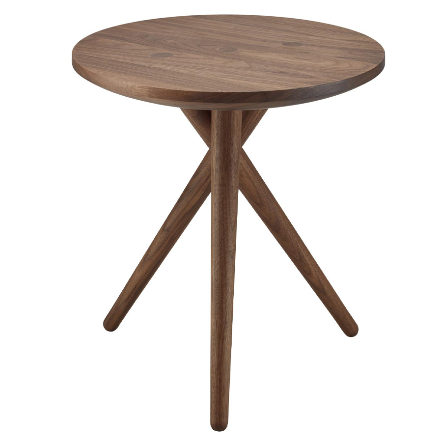 Der Beistelltisch 1025 von James van Vossel steht für maximale Eleganz und minimale Essenz: Drei Holzbeine beschreiben in gleichmäßigen Abständen von je 120 Grad einen imaginären Kreis auf dem Boden. Auf der Oberseite der Tischplatte erscheinen sie als perfekt aneinandergereihte, plan abschließende Kreise. Der unterschiedliche Verlauf der Maserung der drei Tischbeine, welche sich nach unten hin verjüngen, erzeugt einen zusätzlichen grafischen Effekt im Verhältnis zur Tischplatte.