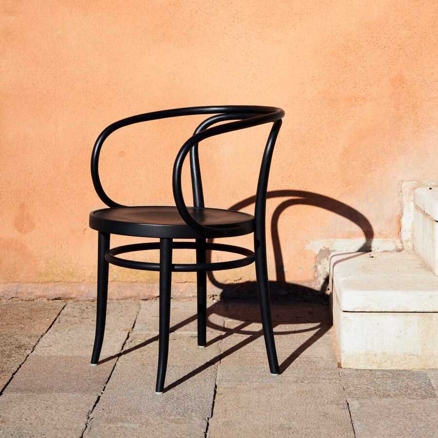 Dieser elegante Bugholz-Klassiker ist ein Meisterwerk in Konstruktion und Fertigung: Der ausladende Bügel, der Rücken- und Armlehne zugleich bildet, wird in einem Stück aus massivem Buchenholz in seine Form gebogen. Wie das Urmodell der Bugholzstühle, Modell Nr. 214, besteht der 209 ebenfalls nur aus sechs Teilen.