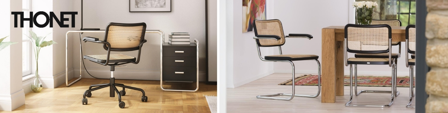 Der Thonet S 32 ist einer der bekanntesten und meistverkauften Freischwinger überhaupt. Er wurde 1928 von dem berühmten Designer Marcel Breuer entworfen und vereint auf perfekte Weise traditionelle und moderne Einflüsse. Der Sitz und die Lehne des S 32 von Thonet bestehen aus Massivholz mit Rohrgeflecht – hier greift Thonet auf seine Erfahrung in der Produktion von Bugholzmöbeln mit typischem Wiener Geflecht zurück, denn immerhin war es der Firmengründer Michael Thonet, der schon um 1830 herum ein Verfahren entwickelte, mit dem Bugholz unter Zuhilfenahme von Wasserdampf gebogen werden konnte. Später erfand Michael Thonet so den legendären Wiener Kaffeehausstuhl. Beim Thonet Freischwinger S 32 sowie der Variante mit Armlehnen Thonet S 64 werden Sitz und Lehne durch das moderne Gestell aus Stahlrohr perfekt ergänzt: Etwa 100 Jahre nachdem Michael Thonet mit Bugholzmöbeln den Unternehmenserfolg begründete, war Thonet in den 1930er-Jahren der weltweit führende Hersteller von Stahlrohrmöbeln.