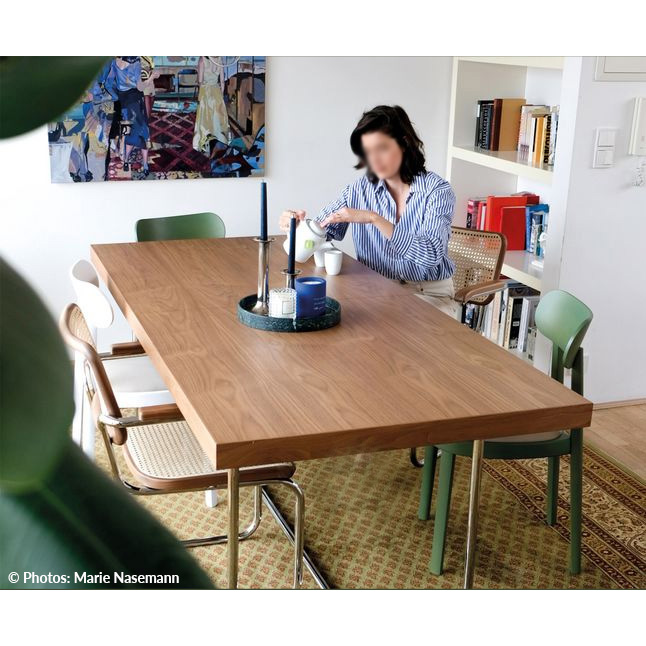 Der THONET S 1070 ist ein klassischer Tisch mit besonderen Details: Das filigrane, elegant geschwungene Gestell aus Stahlrohr ist kombiniert mit einer schlichten Tischplatte aus Holz. Die Modelle S 1071 und S 1072 lassen sich mit unterschiedlich großen Einlegeplatten verlängern. Aufgrund der formalen Reduktion und der Auswahl unterschiedlicher Oberflächen eignen sich diese Tische sowohl für Zuhause als auch für Besprechungsräume.
