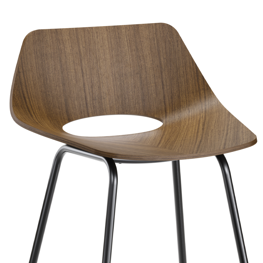 Seine Formholz-Sitzschale lebt von der Schönheit des natürlichen Materials und begeistert in elegantem Nussbaum, warm anmutender Eiche, Buche natur oder gebeizt. Das Stahlrohrgestell ist wahlweise verchromt oder pulverbeschichtet.